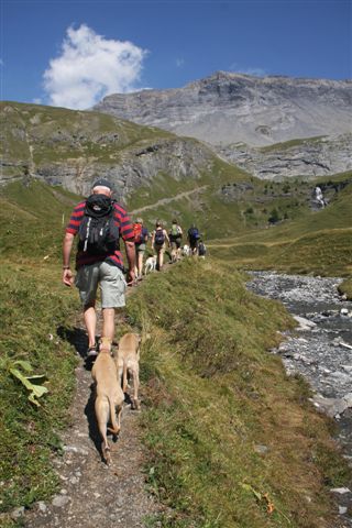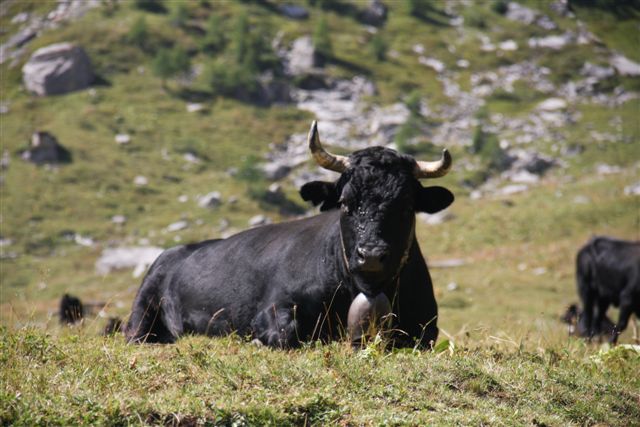Wat zijn Alpen zonder koeien….. deze zwarte meiden waren totaal niet onder de indruk van ons of onze honden. Andersom wel; Hinde hield ruim afstand van ze, met als gevolg dat ze het schrikdraad raakte. Dat deed z’n naam eer aan: ze wist niet wat haar overkwam en slaakte een schrille kreet ;>).