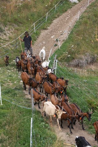 Leuk tafereeltje bij de “Cave du Scex”; de kudde geiten kwam net thuis, onder begeleiding van herder en Pyrenese berghond (kennelijk ook geschikt voor de Alpen ;>).