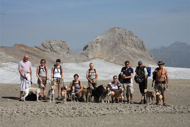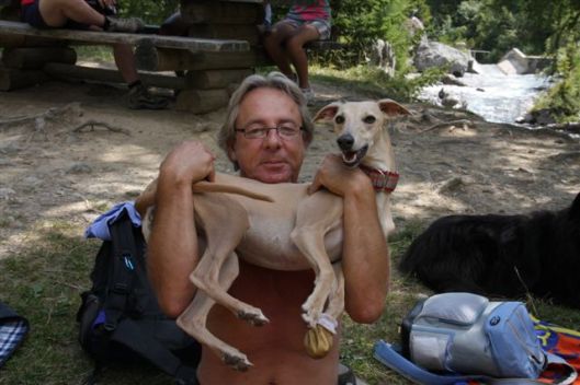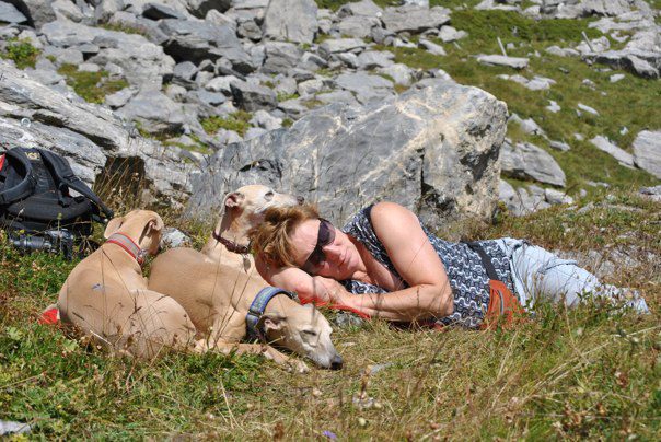 Mozart deed het dit jaar ook weer fantastisch in de bergen. Ondertussen is het alweer twee jaar geleden dat hij verlamd raakte door een hernia en moest worden geopereerd om te overleven. Hans en Elly, wat ziet hij er toch altijd dapper en happy uit. Hij showt hier zijn ballonnen met babysokjes, ideaal schoeisel voor whippetvoeten die niet dagelijks op het harde hete steen in de Alpen lopen.