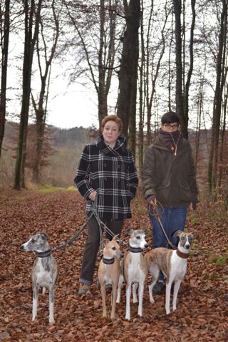 We hebben nooit gebrek aan gespreksstof, het gaat natuurlijk over whippets, en heel soms ook andere onderwerpen ;>). En we maken mooie wandelingen met Love, Ayrheen, Lily en Abby, het 14-jarige Jack Russeltje. Op deze foto sta ik naast Angie, de eigenaresse van Niobe; Niobe is een dochter van Lily uit het Autumn Love’s B-nest en heeft dezelfde vader als Donna van Annemarie. Deze foto is trouwens nèt gemaakt nadat een reebok met veel herrie ons pad overstak, een paar meter van ons vandaan. De dames stonden nog een beetje te steigeren in hun tuig ;>))