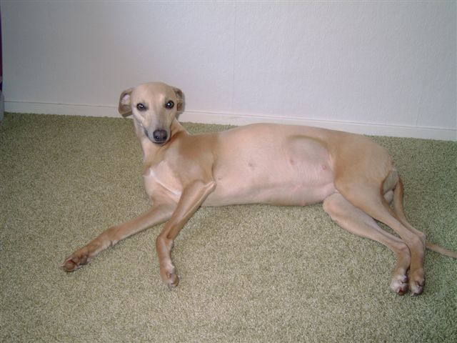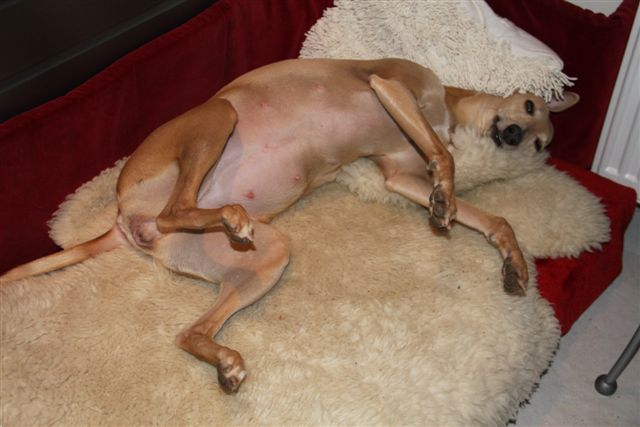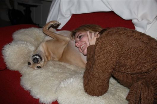Nikki kwam dit weekend meehelpen met allerlei klusjes die moeten gebeuren voor het nest geboren wordt. En het volgen van de zwangerschap van een whippet die je goed kent is een leuk “projectje” voor iemand die dit jaar diergeneeskunde gaat studeren. Hier luistert ze naar het geborrel en gepruttel van Hinde’s pupjes en Hinde lijkt het erg lollig te vinden ;>)).
