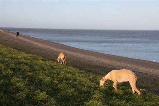 Vandaag en morgen heb ik vrij. Twee dagen om thuis rond te keutelen, en op de bank te hangen met de dames. De stapel fris gewassen dekentjes voor de werpkist ligt klaar. Het is vandaag dag 62; Hinde is nog altijd fris en monter; ze slaat steevast voor iedere wandeling haar schapenvacht dood en loopt opgetogen mee over de dijk. Alle honden worden door Chloe en Jewel weggejaagd sinds Hinde is gedekt, en Hinde geniet zichtbaar van het hebben van twee bodyguards.