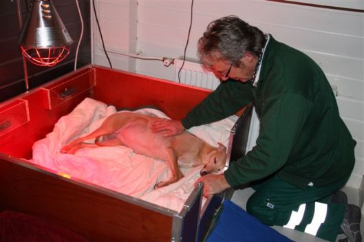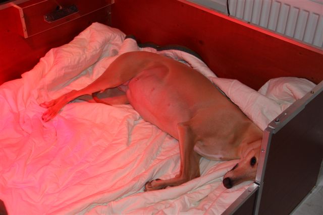 Hinde lag duidelijk te genieten in haar nieuwe hol. Er komt warmte van boven en van onderen, maar niet helemaal op “haar helft” van de werpkist, zodat ze het comfortabel heeft bij het zogen. En er zitten maar liefst twee thermometers in, die de temperatuur van de bodem en de lucht in de kist meten. Ronald heeft er echt zijn best op gedaan, maar het heeft wel wat voeten in de aarde gehad. De kist is nét op tijd af, want ze begon de laatste dagen hier en daar in manden en dekens te krabben om voor zichzelf een mooi nest te creëeren. Dat doet ze heel wat beschaafder dan haar moeder Jewel, die haar nest het liefst wilde baren onder een grote adelaarsvaren in de tuin. Daar was ze een paar dagen lang ijverig een soort wolvenhol aan het graven. Maar ik wilde haar niet assisteren met stratenmakerskniebeschermers om de knieën gebonden en dus werd het scenario eenzijdig omgegooid.