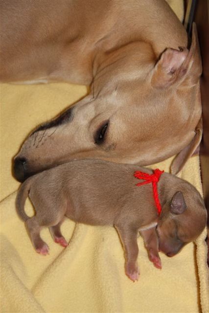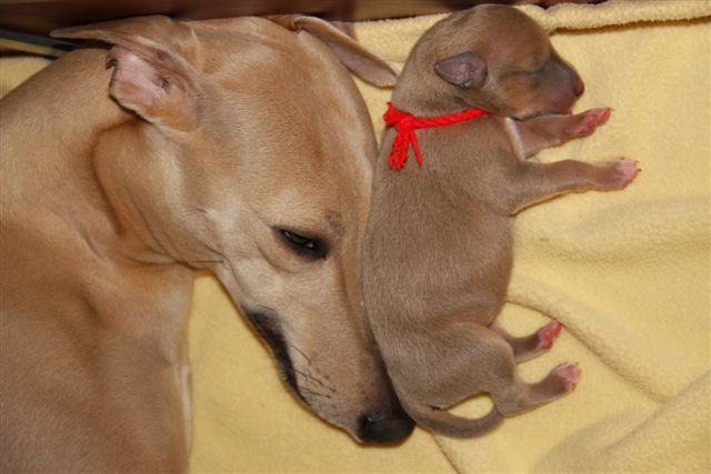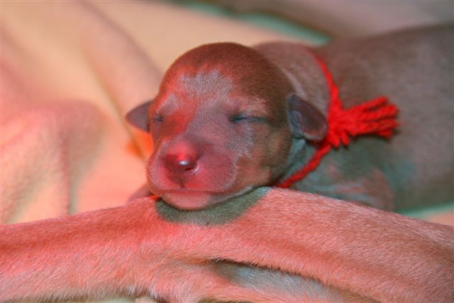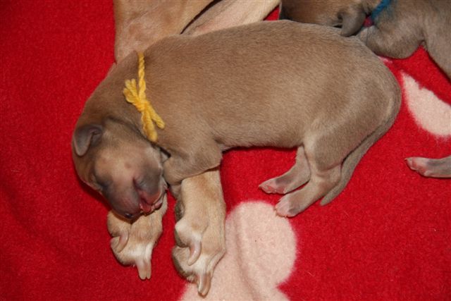 De groene reu lust er wel pap van; hij ligt vaker dan de anderen bij te tanken en weegt nu maar liefst 571 gram; hij is dus 161 gram aangekomen. Wat hij goed kan met zijn krachtige snuitje, is het in bedrijf houden van de voorste, vaak moeilijk te stimuleren tepels. Er zijn er nu 8 in gebruik door maar 4 pups…….