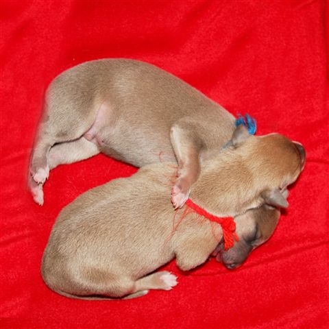 De blauwe reu weegt 482 gram en is 142 gram aangekomen. Hij en het rode teefje waren de eerstgeborenen en liggen hier samen innig omhelst uit te buiken.