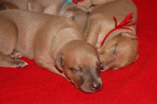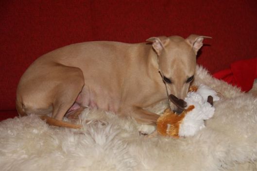Alhoewel…. als je in ze knijpt, dan kunnen ze heel hard piepen. Natuurlijk zijn deze diertjes bedoeld om zich in de nestgeur van de B’tjes te rollen, en vervolgens over een week of zes met hun eigen pup mee op reis te gaan, naar hun nieuwe huis. Maar Hinde dacht dat ze allemaal voor hààr waren….