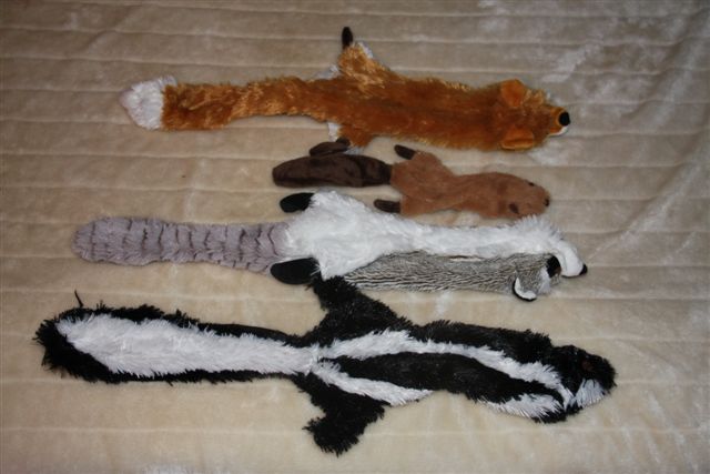 De buit is binnen Annemarie! Vanmiddag ontving Hinde een verrassingspakket met een lieve kaart van Donna, “van kraamvrouw voor kraamvrouw”, met daarin 4 dode dieren: een vos, een bever, een wasbeer en een stinkdier. Nou nou, Donna heeft goed haar best gedaan in het bos ;>)). En ze zijn vakkundig gevild: “no stuffing”, stond erop.