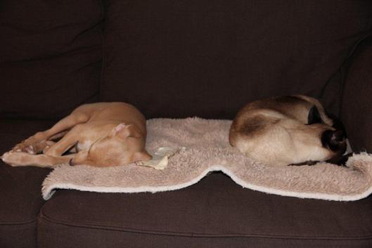 Soms ligt Megan samen met de poes op de bank, het gaat langzaam maar zeker steeds beter. Ze wil vaak met de twee katten spelen, maar daar hebben ze tot nu toe weinig zin in. Met name van de kater krijgt Megan dan even een pets boven op haar schedel om de rollen even duidelijk te stellen, en die boodschap komt goed binnen ……