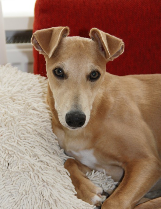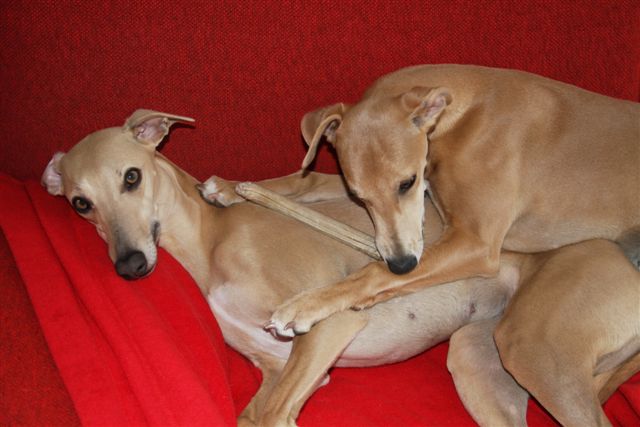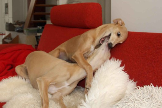 Kijk, langzaam probeert ze de groep te verlaten, en ze “tongelt” om aan te geven dat ze zich niet helemaal pluis voelt. Zie de triomfantelijke whippetgezichten, terwijl ze haar uitgeleide doen ;>)