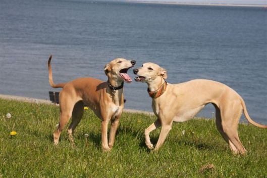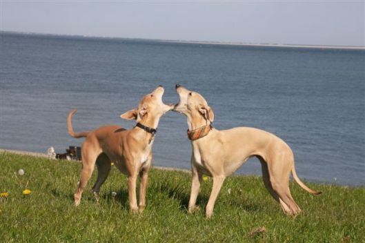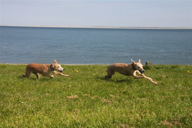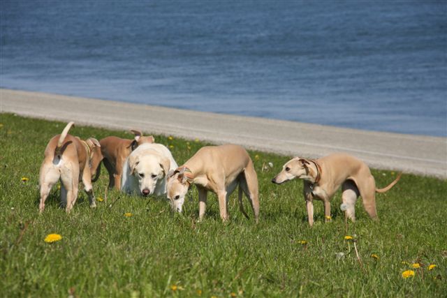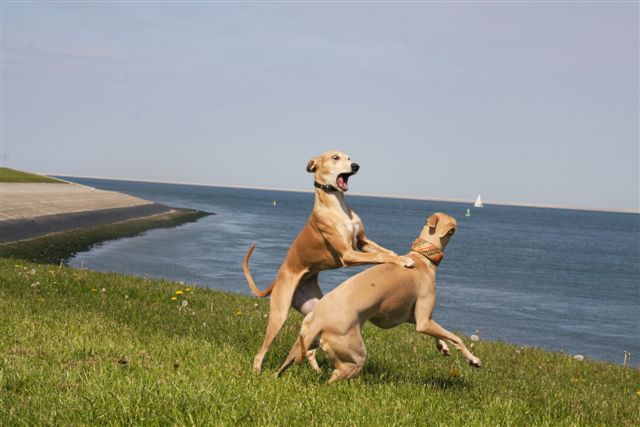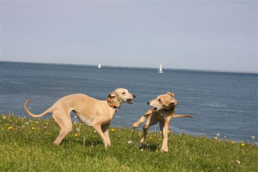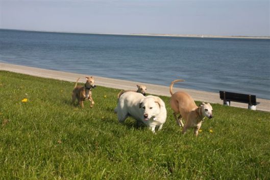 Op de dijk komen we veel honden tegen en dat is heel goed voor Hazel, die haar sociale vaardigheden verder verbetert. Op de foto een dikke labrador in de groep. Het ziet er gezellig uit, maar eigenlijk houden de dames haar hier als “gijzelaar”. Hoe groter je groep whippets, hoe meer kans dat ze het overwicht van de groep laten gelden. Van bijten komt het gelukkig nooit, het blijft bij een beetje pesten. Zouden teven hier meer naar neigen dan reuen, vraag ik me af?
