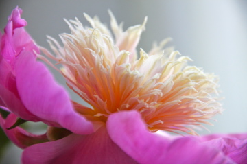 Het herstelhotel De Kim in Noordwijk is fantastisch; geweldige zorg, prima eten, fijne kamer. Veel oude mensen, die herstellen van heupoperaties, maar ook daar zitten weer leukerds bij die om vijf uur ’s middags gezellig een flesje wijn voor je open trekken op hun kamer ;>)). Het litteken op mijn buik heelt goed, maar van wandelen over het strand komt nog niet veel. Mijn camera bleef ongebruikt liggen, tot ik een andere horizon ontdekte, dichterbij, in mijn eigen kamer. Het zijn de mooie en lieve dingen die voor me werden meegebracht op opgestuurd ;>). Zoals deze prachtige pioenrozen;