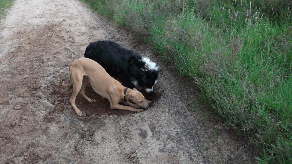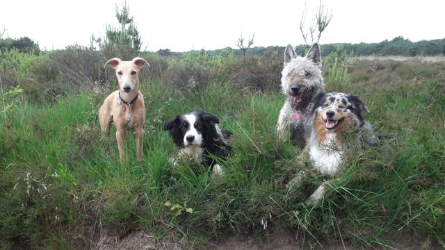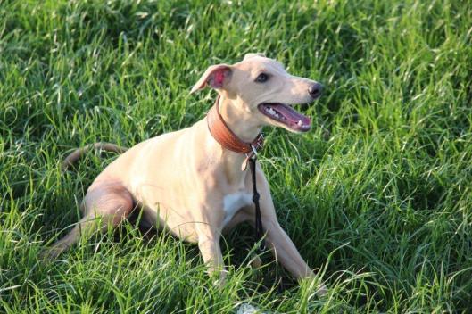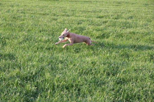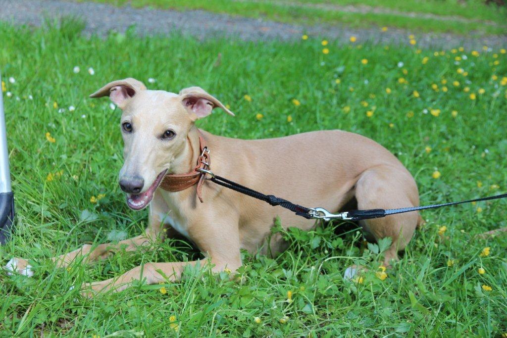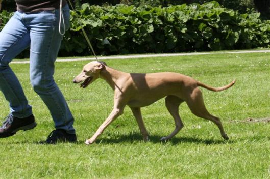 Nou, wat dacht je van een beetje ringtraining, voor de jonge hondendag van de Ned. Whippet Club van a.s. zondag 17 juni. Geen overbodige luxe met deze wilde en vrolijke spring in het veld ;>)