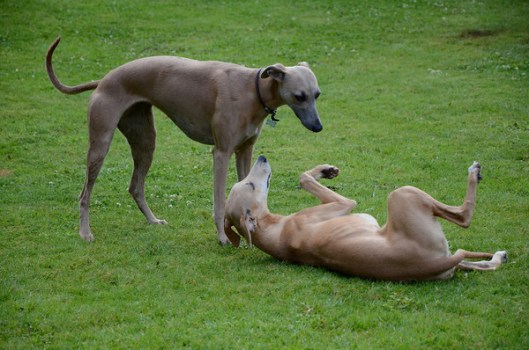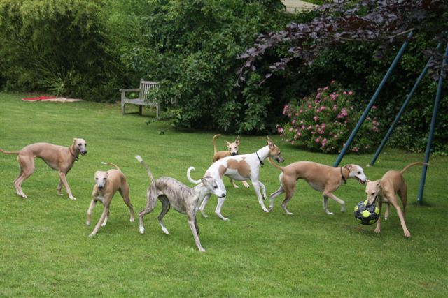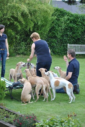 De whippets konden naar hartelust spelen in de tuin, en de Vlamingen en Hollanders waren goed aan elkaar gewaagd. Bij de hondjes waren de meiden in de overhand: James, Maestro, Bowie en Funky kwamen ogen en oren te kort, met 15 meiden om zich heen ;>). Hier zien we van links naar rechts Dyllis, Dune, Dusty, Zoë, Hazel, James en Hinde.
