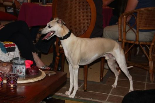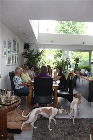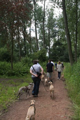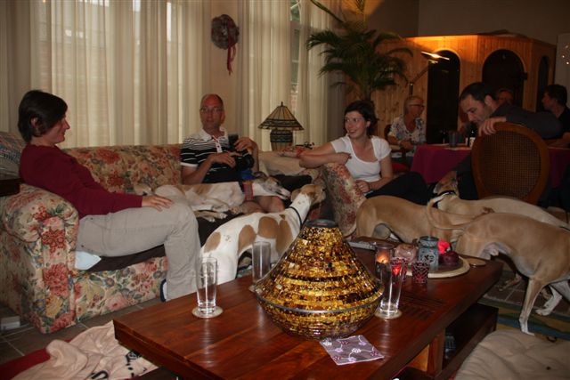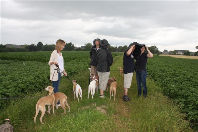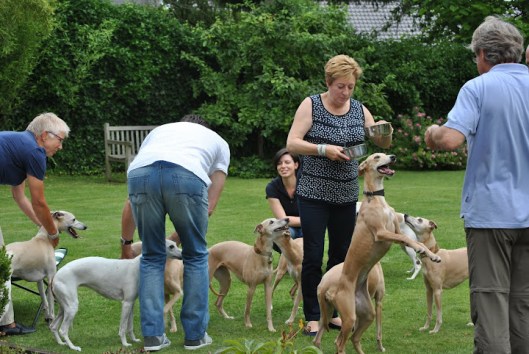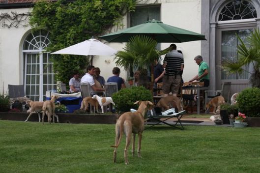 Op de zaterdag waren we uitgenodigd bij Lut en Geert, de ouders van Evelien. Het was een regenachtige dag, maar we hebben desondanks wat tijd kunnen doorbrengen in hun heerlijke tuin: “we” waren 8 Vlamingen en 5 Hollanders, en 19 whippets. En dat ging allemaal goed; geen onvertogen woord is er gevallen, één van de mooie aspecten van ons bijzondere ras. Het begon met champagne, gevolgd door een heerlijke lunch.
