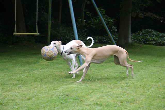 Afgelopen weekend waren we te gast bij de twee Sandjes die in België wonen: Zoë (met bal) van Evelien en Dune van Virginie.