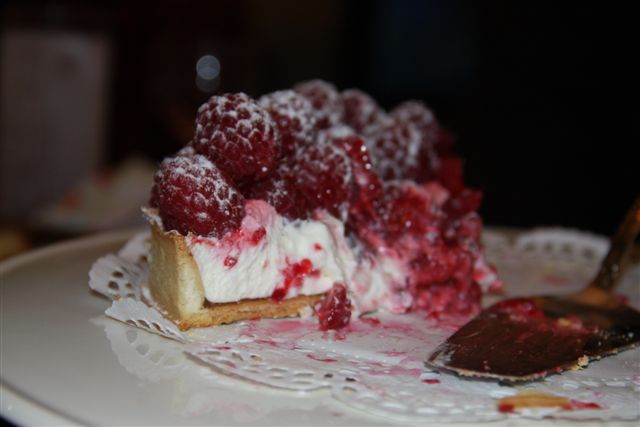 Het diner werd afgesloten met een heerlijke frambozentaart met krokante bodem….. zó krokant dat mijn stuk van mijn bordje vloog, waardoor ik op mijn knieën eindigde, om het tapijt schoon te boenen ;>))