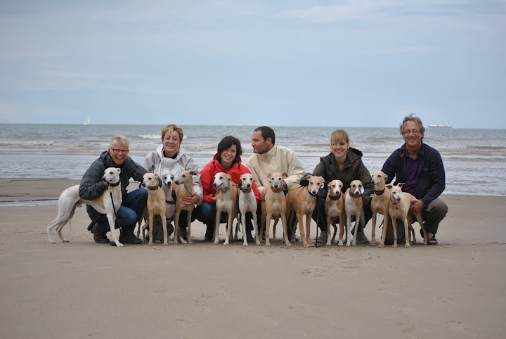 Groepsfoto: Elly met Maestro en Chloe, Monique met Dusty en Dune, Evelien en Wim met James, Zoë en Jewel, Nikki met Hazel, Ivy en Zoë, Ronald met Hinde en Isis. Virginie achter de camera.