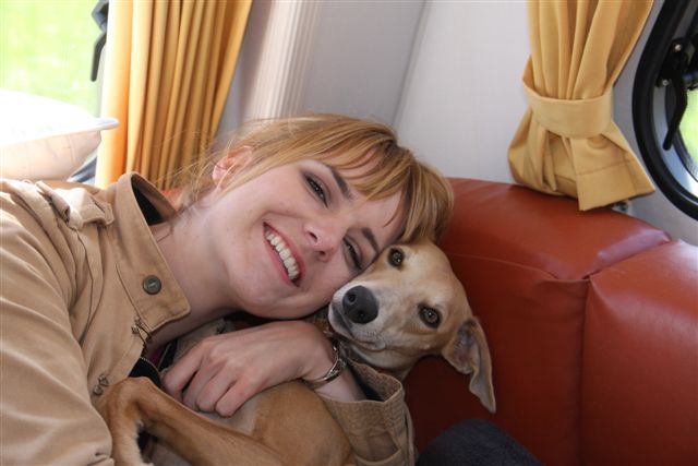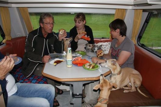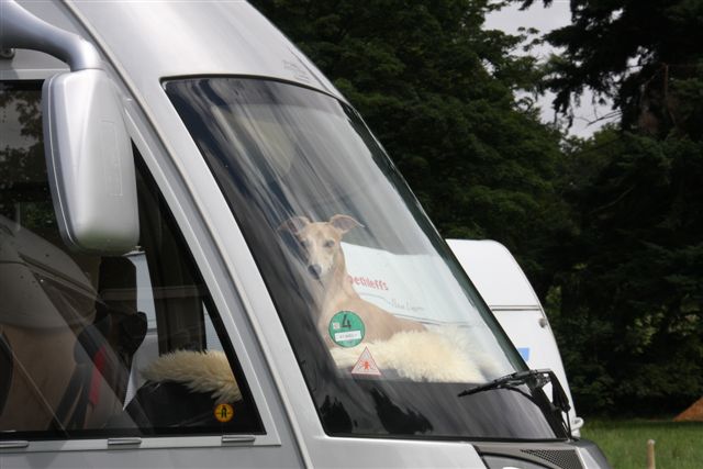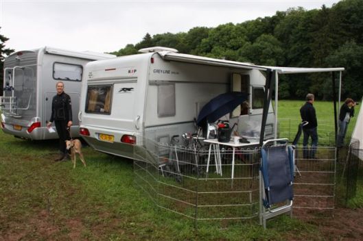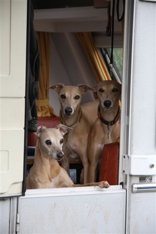 Chloe, Hinde en Hazel bij de caravandeur. Wij hadden Isis en Jewel niet mee dit weekend; Isis is praktisch blind en is niet 100% ingenomen met de caravan; Jewel’s geopereerde poot gaat sinds een paar dagen helemaal niet goed (er zit een ontsteking in en de voet werd enorm dik) en dus bleef zij ook bij mijn moeder zodat ze haar medicijnen en voetbadjes tijdig kon krijgen. Hazel was mee, maar we hebben haar niet geshowd; ze is momenteel een grote, magere slungelpup, en daardoor niet in showconditie.