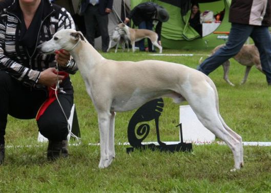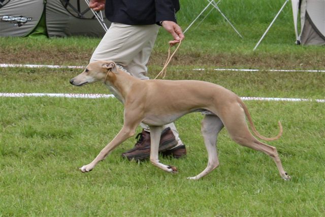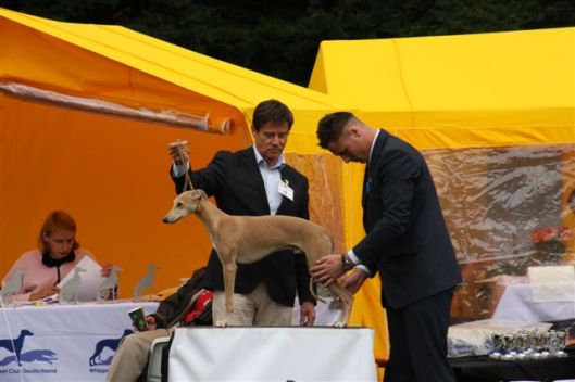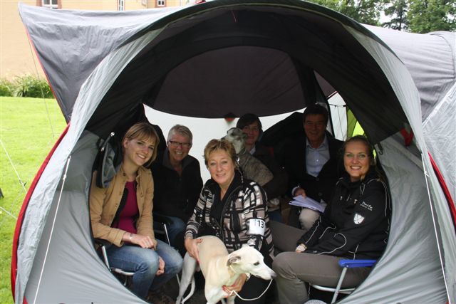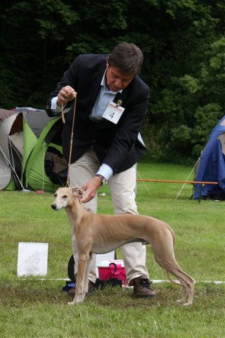 Patsy keurde op zaterdag de reuen en op zondag de teven, en de Zweedse keurmeester Magnus Hagstedt (Signum whippets) deed dat andersom. Ik vond vorig weekend in België dat Hinde’s nestbroer Maestro (Salty Sand’s Anthem Of Atlantis) er mooi uitzag en dus had ik hem in overleg met zijn eigenaren Elly en Hans op de valreep nog ingeschreven in de open klas reuen. Er waren 12 reuen ingeschreven, en in eerste instantie leek het of Patsy hem in de stromende regen geen blik waardig keurde. Maar niets was minder waar; hij won zelfs zijn klas en verdiende daarmee een VDH-kampioenschapspunt!