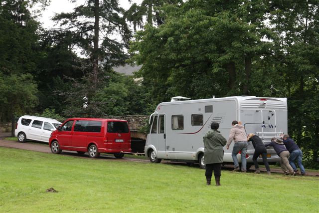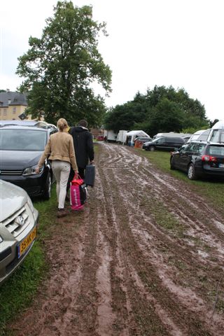 En dit is een voorbeeld van hoe een aantal auto’s (ook die op four wheel drives leken maar het niet waren ;>), campers en caravans het terrein na afloop verlieten. Ik was de enige die nog een trekkabel had rondslingeren in de kofferbak en het ding heeft achter de four wheel bestelbus van Hajo zijn dienst meerdere malen bewezen. Ik heb hem aan de WCD geschonken maar hoop van harte dat dit modderbad zich niet opnieuw zal aandienen in de toekomst. En dan komt er toch van alle kanten een extra handje hulp, met name Roosmarie en Mark Wibier trokken allerlei hulpstukken én hun handen uit de mouwen…..