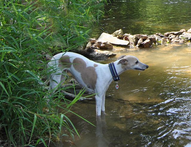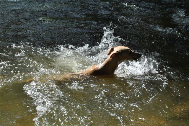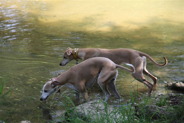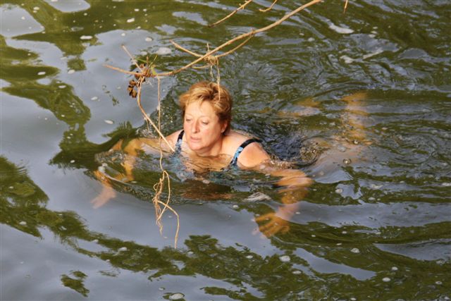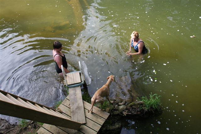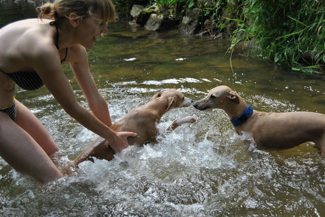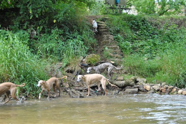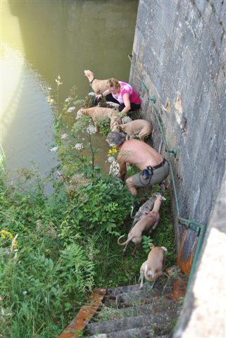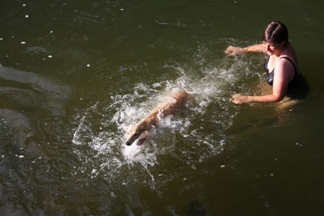 Op sommige plekken lieten we de honden “te water”, dat was op de eerste dagen van de week, toen het nog zo’n heet weer was!