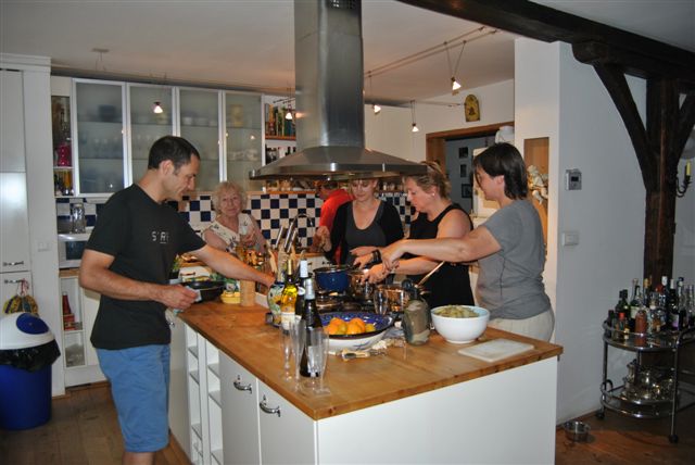 Buiten zwaaide Virginie de scepter over de BBQ, maar binnen lag het bereiden van de maaltijden in de keuken op mijn bordje; en er was gelukkig altijd plaats genoeg voor al die helpende handen aan het kookeiland ;>)