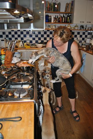 Dusty krijgt een voorproefje van het pannetje met gekookte rijst, pasta, visnat en carnibest, dat we na afloop hadden gemixt voor de elf viervoeters.
