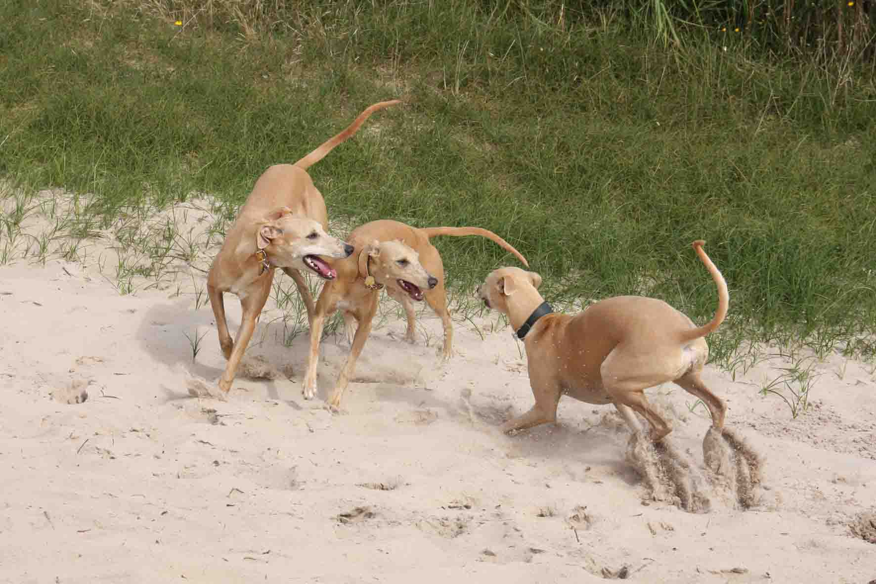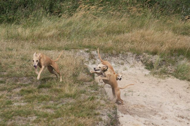 Megan vliegt het duintje weer op, met Hazel en Hinde achter zich aan;