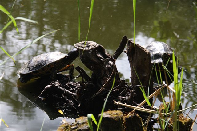 Aan de rand van het bosmeertje zaten deze twee roodwangschildpadden te zonnebaden. Het zijn losgelaten huisdieren die geweldig gedijen in de natuur – ondanks de toch stevige winters in de afgelopen jaren. Ze groeien als kool!