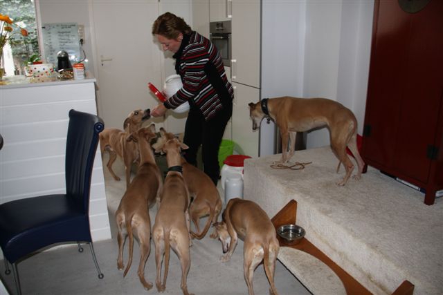 Virginie en Tessa hebben een fantastisch mooie klus geklaard en zes puntgave pups klaargestoomd voor een mooi leventje bij lieve mensen, één geluksvogeltje blijft natuurlijk bij hen zelf. De pups zijn in aanraking geweest met heel veel verschillende mensen, honden, een kat, kinderen, en de CD met onweer-, vuurwerk- etc. geluiden. Ze zijn mee in de auto geweest, hebben geoefend aan het riempje, hebben buiten gespeeld, zijn bedolven geweest onder een lading zeer gevarieerd speelgoed, hebben zichzelf schotvast gemaakt met behulp van ballonnen en zijn dagelijks stevig geknuffeld en goed gevoed in huize Busschaert. Ze vertrekken met een enorme bruidsschat, met o.a. halsbandje, riempje, jasje, mandje en knuffels met nestgeur, instructieboekje etc. Echt klasse allemaal.