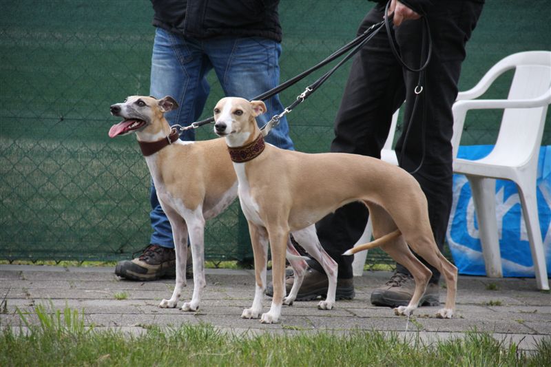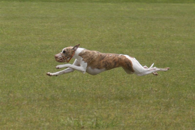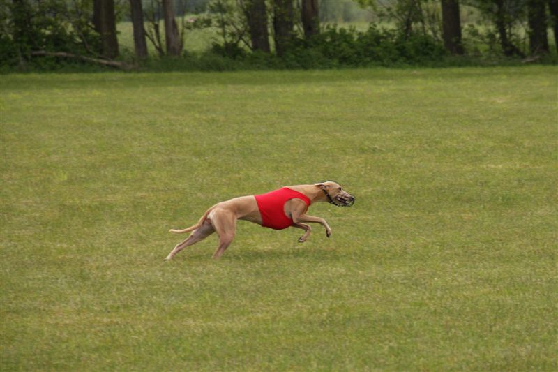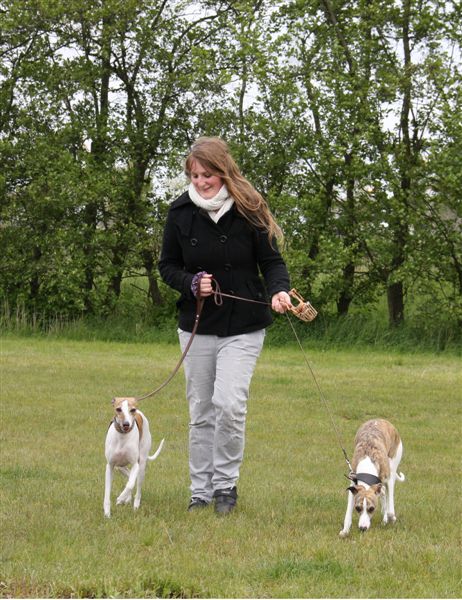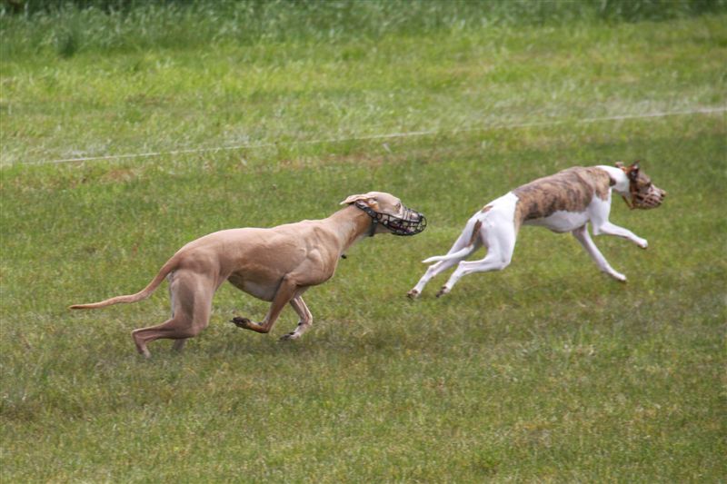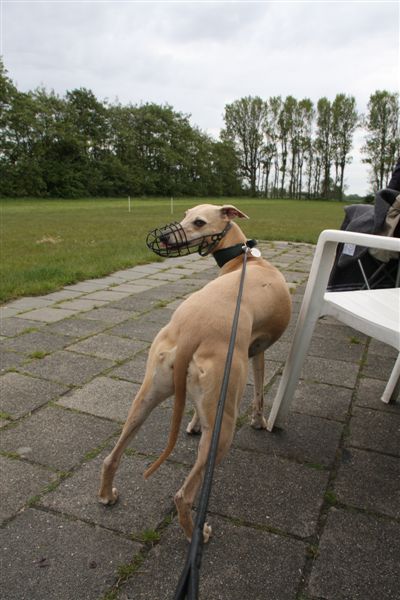 Hazel en Zoë deden samen nog een rondje; dat was een soort strijd tussen Goliath en David, ze verschillen enorm in bouw en maat. Maar dat mag de pret niet drukken ;>). Hazel was denk ik wel de allerfanatiekste windhond op deze trainingsdag; ze is verschrikkelijk luidruchtig en sterk, bijna niet te houden en trekt monsterlijke gezichten ;>)