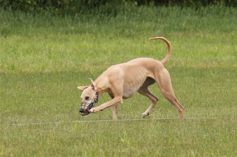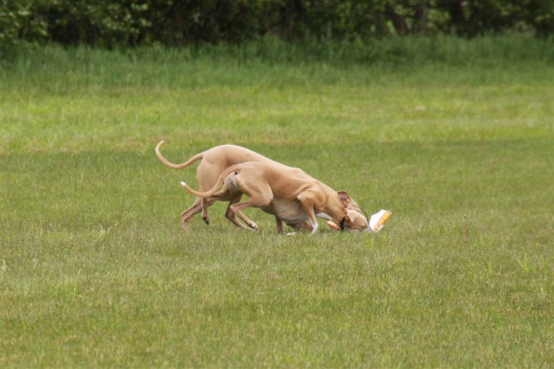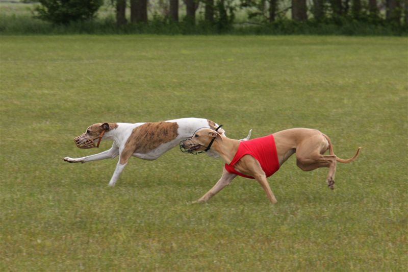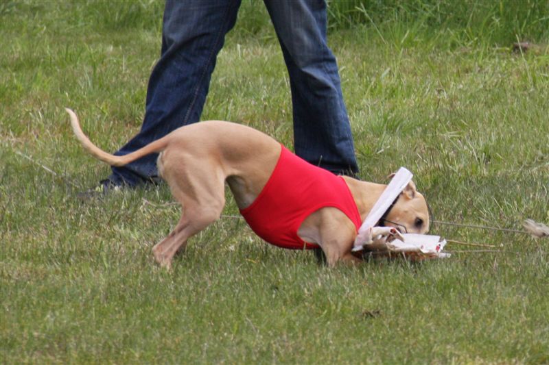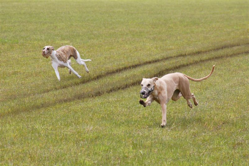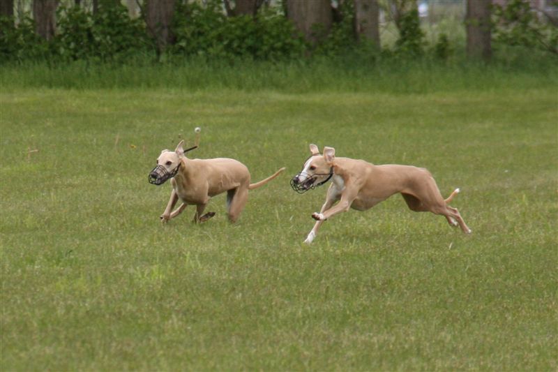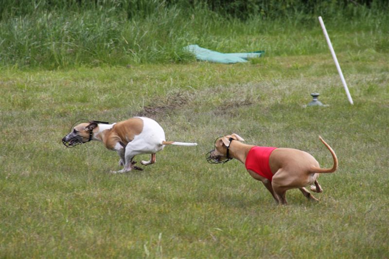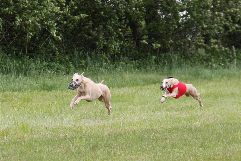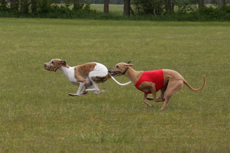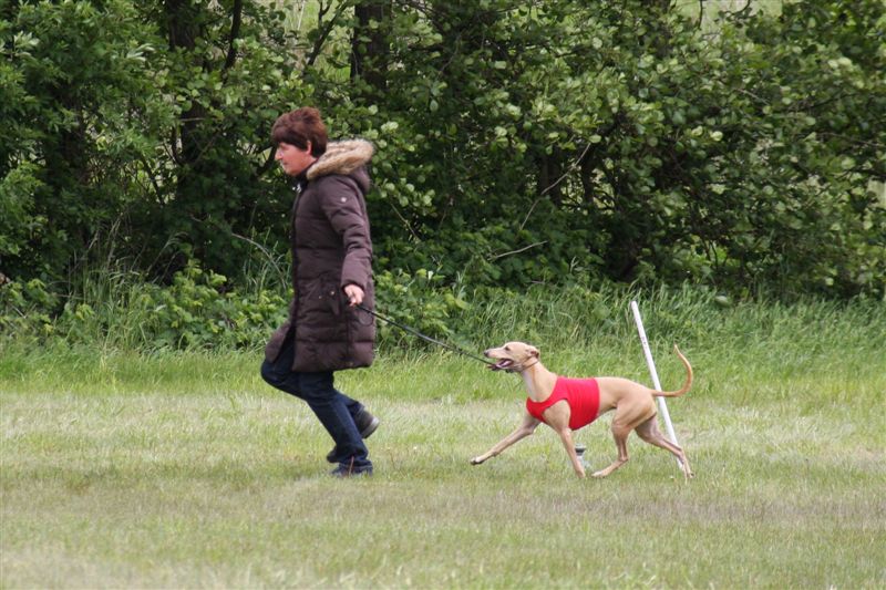 Hinde heeft haar coursinglicentie al en mocht Ivy begeleiden tijdens haar haasvastronde. Dat ging prima, die twee zijn niet even groot, maar hebben wel een vergelijkbare bouw en misschien komt het daardoor dat zij eenzelfde coursingstijl hebben en steeds dicht bij elkaar in de buurt bleven.