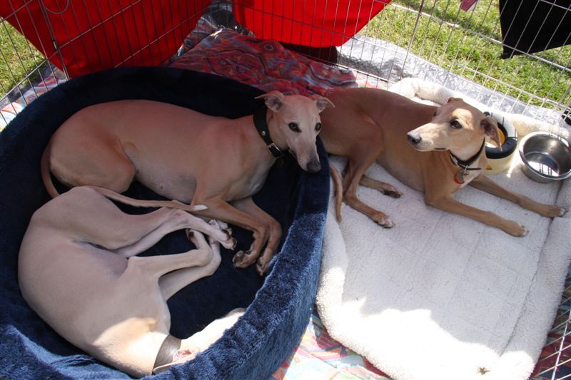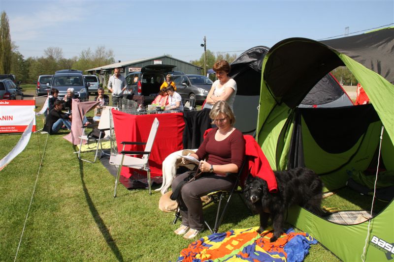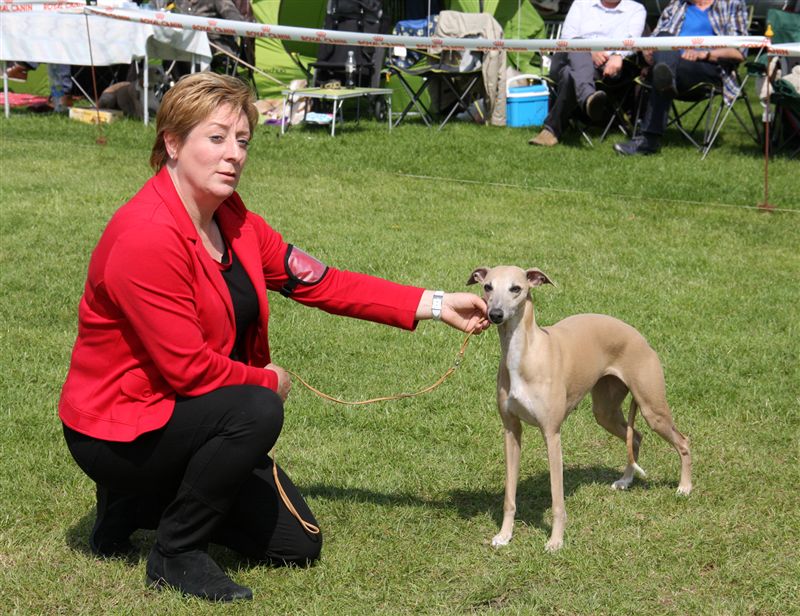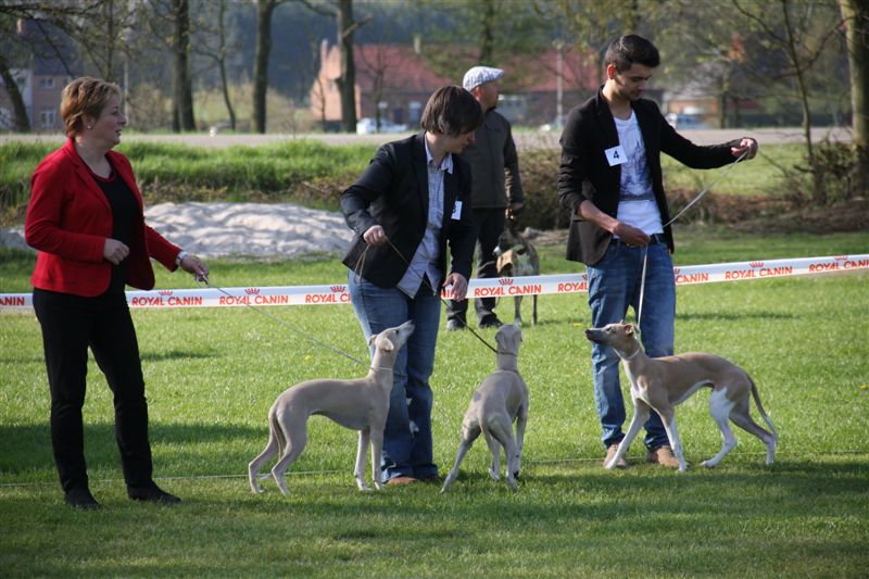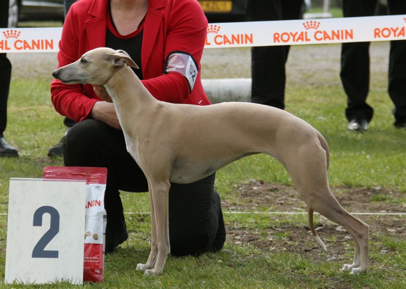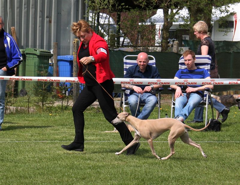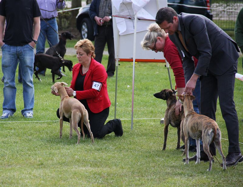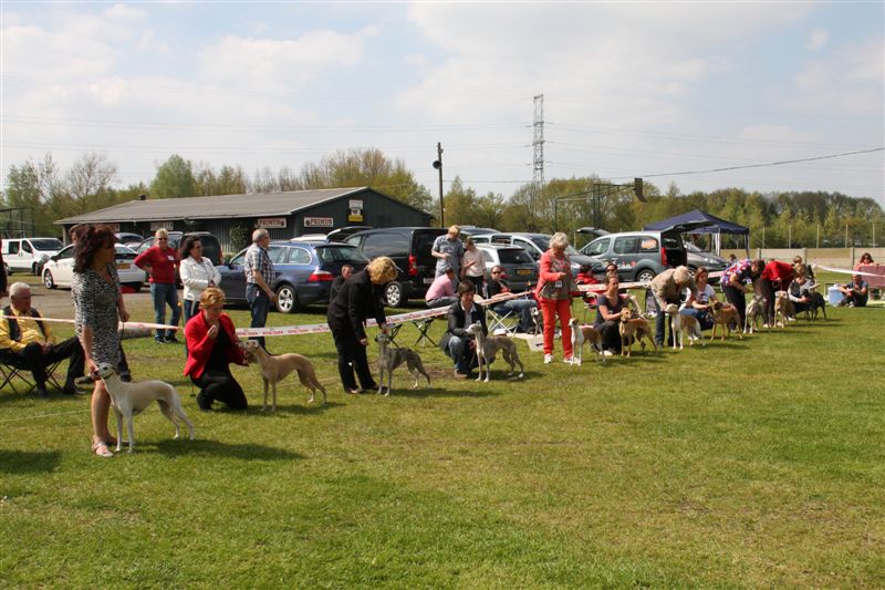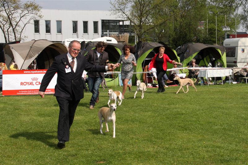 Op 1 mei (Dag van de arbeid, dus hebben de Belgen vrij ;>) hield de Belgische Whippet Club de jaarlijkse clubmatch. Daar gaan we al 12 jaar naar toe als het enigszins kan. Tentoonstellingen die door whippet clubs worden georganiseerd onderscheiden zich van “all breed” tentoonstellingen in die zin dat de keurmeesters rasspecialisten zijn, m.a.w. zij zijn ook actief (of geweest) als fokker en exposant. Dit zijn de mensen wiens oordeel ik hoog schat, en die het de lange rit waard maken. Dit jaar werden de whippets gekeurd door Henrik Harling uit Zweden, die zelf whippets fokt onder de kennelnaam Play A While. Het aantal inschrijvingen ligt op deze shows ook veel hoger; 88 whippets deze keer (op de gemiddelde all breed tentoonstelling gemiddeld tussen 10 en 30). Bovendien is deze Belgische show altijd bijzonder gezellig, en goed georganiseerd. En buiten bovendien, wat heerlijk is voor mens en hond, als het ten minste niet regent!