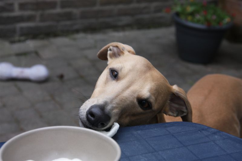 Terwijl Yvonne een poging deed om een puntje boterkoek te verorberen, door het schoteltje zo’n beetje tegen haar neus te houden, deed Hazel een poging om de punt van de fotografe te grijpen ;>). Honden weten het donders goed wanneer het “eigen baksels” zijn, zou het door het hoge % roomboter komen misschien?