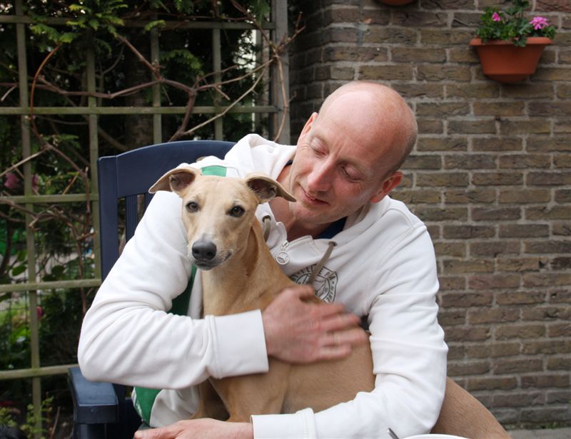 Ome Cor vindt het heerlijk om de zon op zijn gezicht te voelen, en de honden om zich heen te hebben.