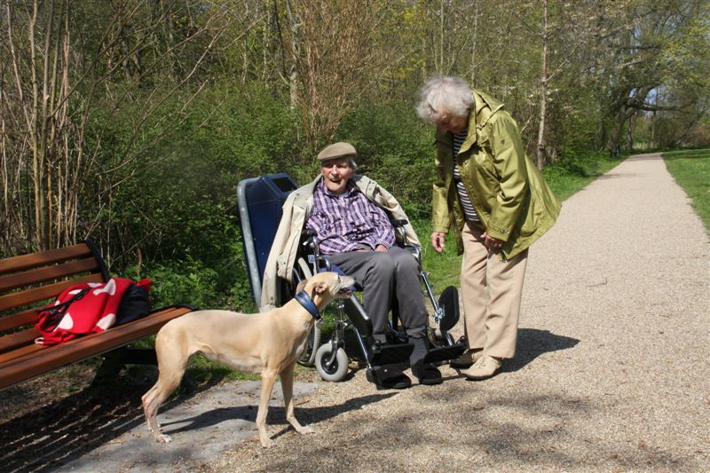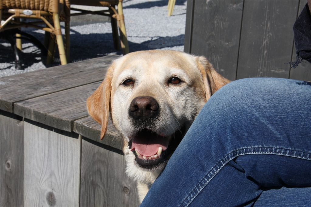 En zij voelen heel goed aan dat hij ze graag om zich heen heeft. Zo hangen we lekker een uurtje rond in het park, voor ome Cor aan de warme middagmaaltijd gaat. De vier dames gaan vaak mee naar binnen, naar de groep waar ome Cor in zit. Het personeel en de (meeste ;>) cliënten vinden honden aan tafel wel gezellig.