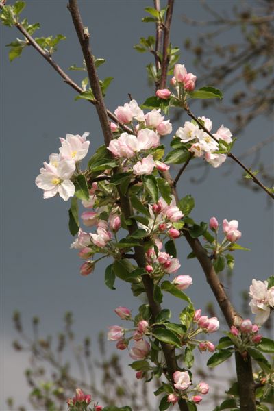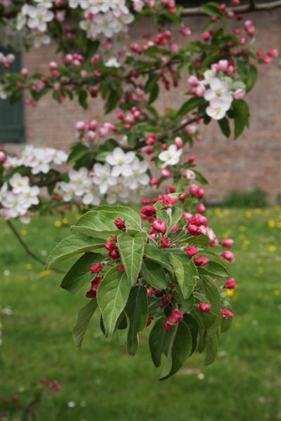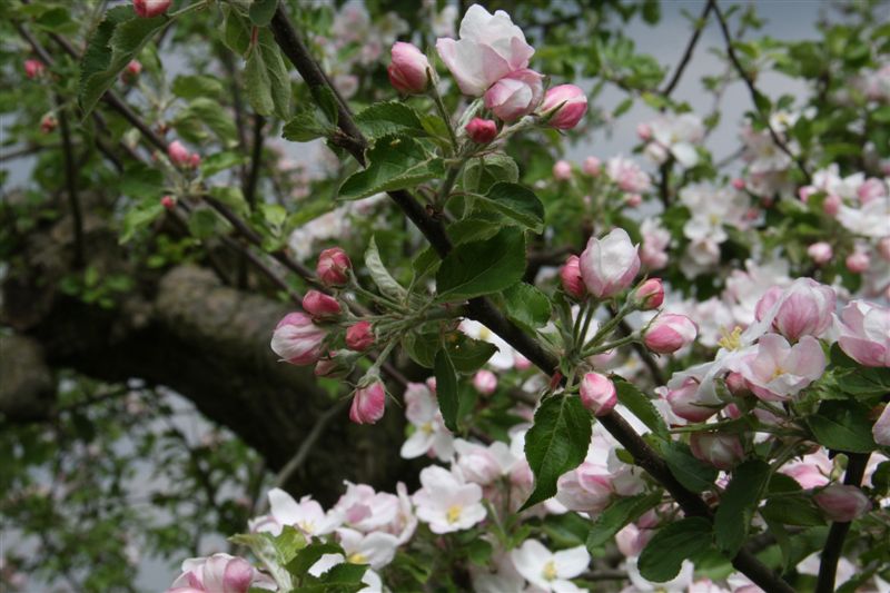 De laatste keer dat wij er waren was vier jaar geleden; toen fotografeerde ik de appelbloem tegen een lichtblauwe lucht; deze keer was het een donkergrijze onweerslucht; ook best mooi.