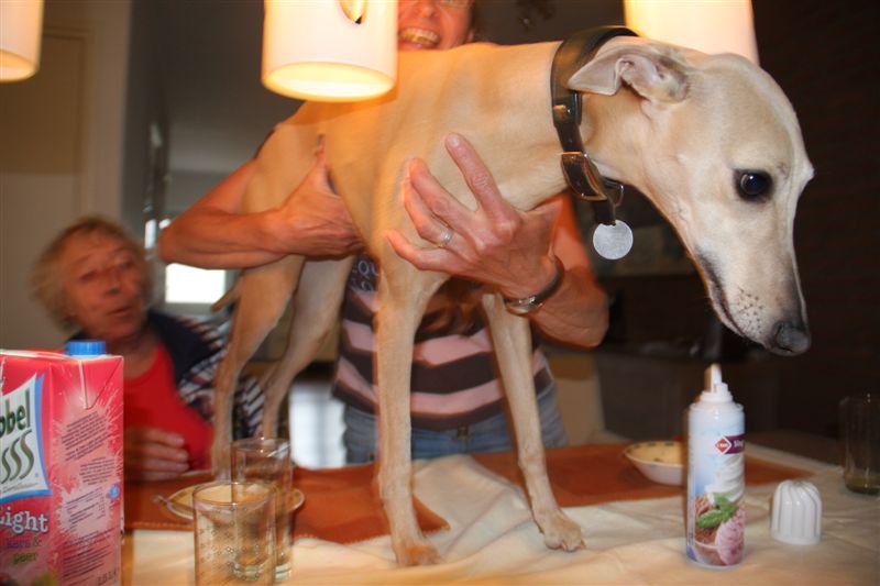 ’s Avonds werd de heerlijke pasta gevolgd door ijs met vers fruit en slagroom, in een wafelchocolade bakje. Hinde vond het nodig om met een sprong midden op tafel te landen. Toen zij weer op de grond was gezet door Yvonne, stond opeens Hazel weer op tafel. Goh, dat doen ze anders nooit!