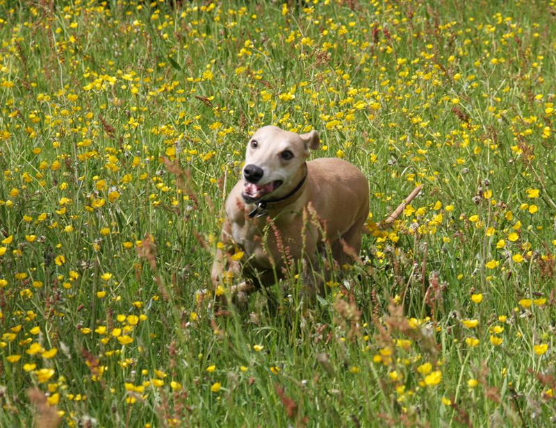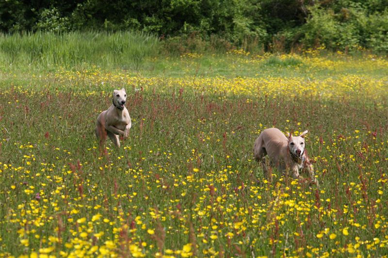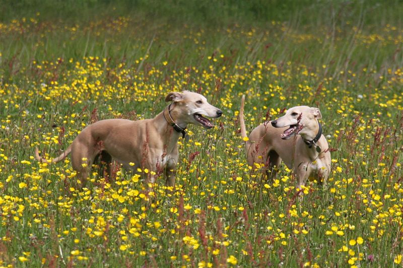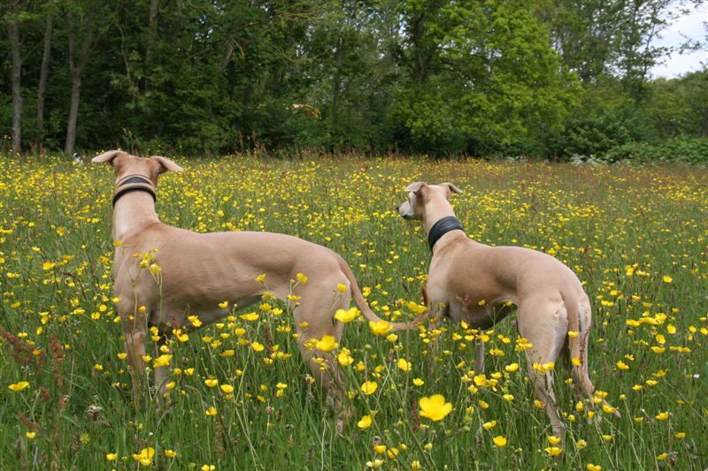En honden kleuren op hun beurt weer mooi tussen de boterbloemen.