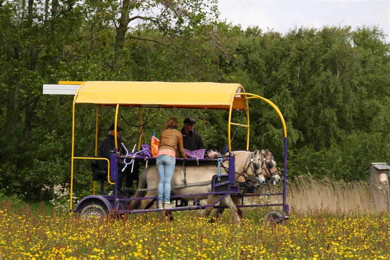 Het is de paardenwagen van Noorderhaven, die ritjes door Mariëndal maakt met cliënten die bovenop de twee ruggen van de Fjordenpaarden meedeinen.