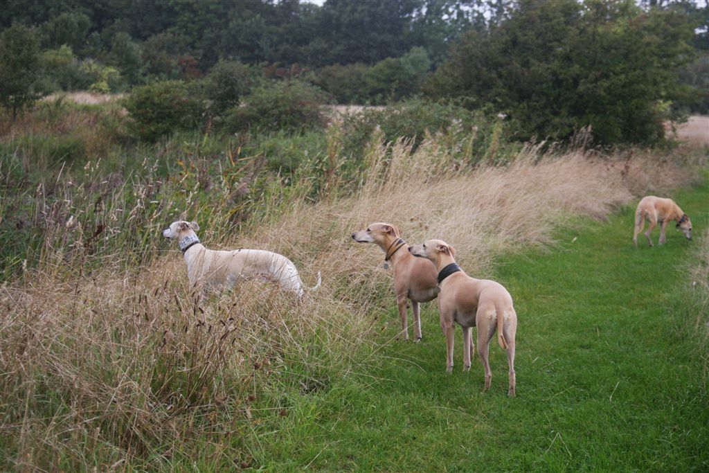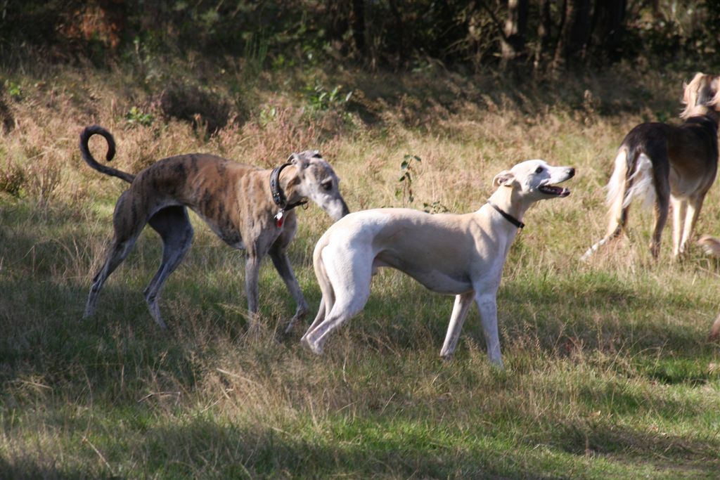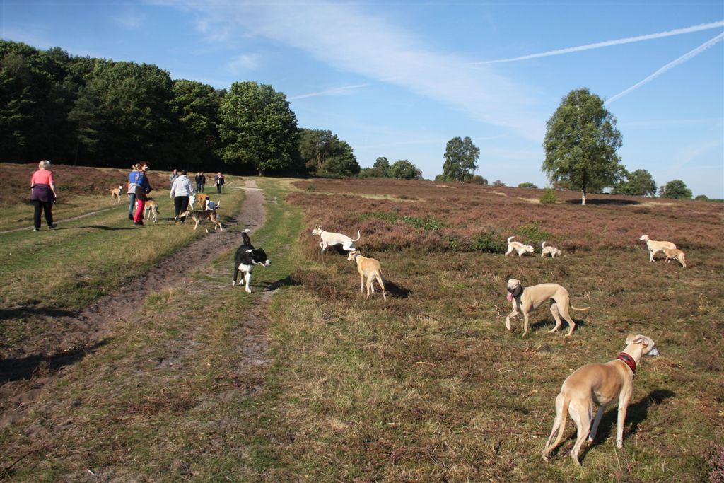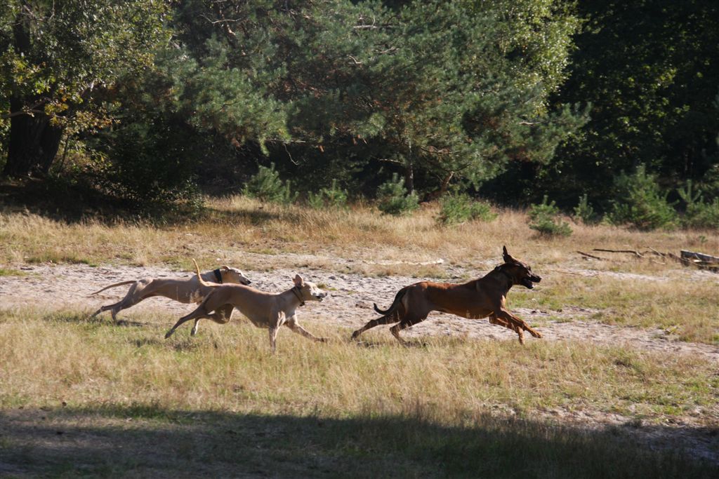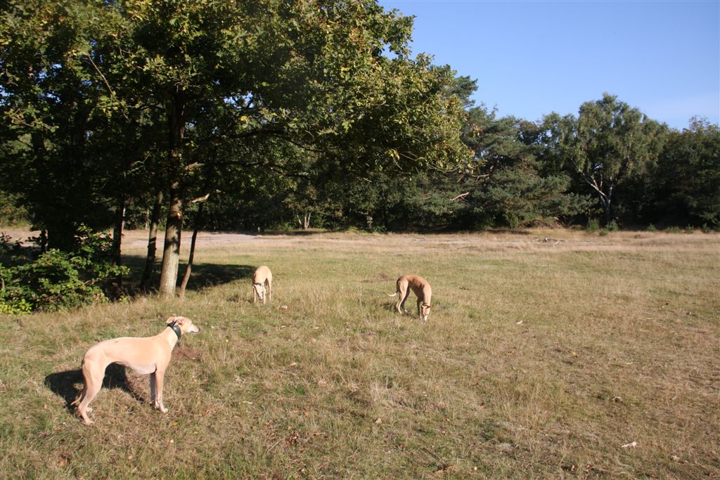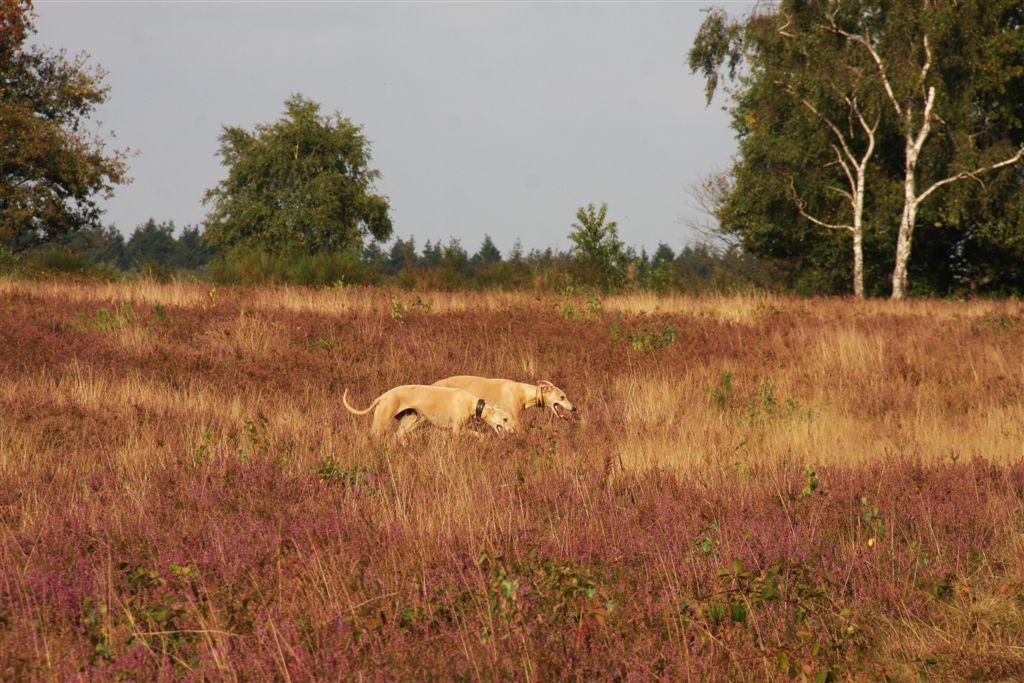 21 sep 2013 001Ik houd echt van de maanden september en oktober; regen en zonneschijn wisselen elkaar in rap tempo af, en de lichtval is warm van kleur. 21 sep 2013 006Mozart en Maestro waren hier te gast, samen met hun personeel. Hans en Elly waren zo lief om vier dagen te komen helpen om het huis van mijn ouders leeg te maken. Er is super hard gewerkt, maar het was tegelijkertijd ook heel gezellig, met lekker eten en mooie wandelingen tussendoor.21 sep 2013 013Jewel’s enige zoon Maestro op zijn gemak in zijn geboortehuis;21 sep 2013 015Mozart idem dito, altijd met een blije lach op zijn gezicht. Hij is Chloe’s enige zoon en is nu 9 1/2 jaar oud. Het is inmiddels vier jaar geleden dat hij verlamd raakte door een stel gebroken rugwervels en daaraan werd geopereerd. Sindsdien heeft hij een beetje eigenaardig loopje, maar geniet met volle teugen van zijn wandelingen en het leven in het algemeen, en een stukje rennen doet hij ook nog steeds.24 september 2013 014In het voorlaatste weekend van september genoten mijn moeder en ik van een dagje in de caravan in Hilversum. De Hoorneboegse heide zag nog prachtig paars. Het plan was om ’s avonds naar huis te rijden, maar toen de buren op de camping hoorden dat we daar eigenlijk nog geen zin in hadden, kwamen ze spontaan aanzetten met schone pyama’s, tandenborstels en tandpasta, helemaal top.  24 september 2013 002De dames beginnen het gebied beter te kennen, en verdwijnen soms even uit beeld. Gelukkig is het gebied netjes omheind, en dat geeft een relatief veilig gevoel.1 oktober 2013 055Het laatste weekend was ik opnieuw in de caravan om wat spulletjes te brengen die we daar goed kunnen gebruiken. Ik moet zeggen, het trekt erg, mijn “tweede huisje” in het bos ;>). 1 oktober 2013 050Elly en Hans kwamen ook een paar zonnestraaltjes pikken en brachten wat lekkers bij de koffie mee;1 oktober 2013 053Uiteraard met Mozart en Maestro.1 oktober 2013 051Er scharrelt heel soms een kat over de camping, dus voor de zekerheid ligt het spul meestentijds achter de tralies…..1 oktober 2013 093Het is ondertussen paddenstoelentijd geworden op de camping en in het bos.1 oktober 2013 076Het gras verliest zijn frisse kleur en vergeelt….1 oktober 2013 072De hei is een beetje minder paars nu; voor het eerst zag ik dat er ook van heide strobalen wordt gemaakt;1 oktober 2013 106Hazel en Hinde spelen met alles wat mee wil doen; hier een nog jonge Rhodesian Ridgeback, die in eerste instantie voor hert werd aangezien ;>)1 oktober 2013 047Maestro kreeg veel aandacht van Nabu, de Galga van mijn buren op de camping. Die twee hebben leuk met elkaar gerend en gespeeld.1 oktober 2013 039Tijdens een wandeling met mijn campingbuurtjes en hun honden, kwamen we nog meer Galgo’s tegen. Het was een zonnige zondag, het was druk op de hei!1 oktober 2013 027Heel veel windhonden op een hoopje;1 oktober 2013 032In de lucht werd iets moois voor ons getekend ;>))1 oktober 2013 099Amber, de Saluki dame van mijn andere campingburen. 1 oktober 2013 098Iedere avond wandelen we met het hele groepje honden nog even vlak voor zonsondergang; er wordt dan druk gespeeld op een open plek in het bos. 1 oktober 2013 091Met name Hinde en Hazel worden zeer actief in zo’n groep honden. Ik moet zeggen dat de camping en het bos en de heide ernaast op zich al fantastisch zijn; maar de aardige en behulpzame hondenmensen van de camping zijn daarbij echt een kers op de taart. Je kunt altijd op ze rekenen, maar iedereen laat elkaar wel met rust.1 oktober 2013 003In de caravan is het qua slapen een beetje behelpen; mijn bed is niet zo groot als thuis, en dus valt er niet fijn te slapen met vier whippets. De oudjes, Chloe en Jewel, zijn gek genoeg het minst kouwelijk van de vier, en dus moesten zij uitwijken naar de rondzit, in een mandje met wat dekentjes.1 oktober 2013 085Na zo’n weekendje in het bos is het ook wel weer lekker om thuis langs de zee te struinen.1 oktober 2013 120Prachtige lichtval op de lijsterbes in Mariëndal;1 oktober 2013 114De dagen worden wel met rap tempo korter. Het laatste plasrondje van de dag vindt allang niet meer plaats in daglicht…..1 oktober 2013 121Na het afronden van de grote klus bij mijn moeder was er weer tijd voor een experimentje met mijn vleesdrogertje; 1 oktober 2013 084Met een spuitzak maakte ik platte porties van een kiloworst Degomeat Kalkoen & vismix.1 oktober 2013 122Met als resultaat een trommel “eerlijke” gedroogde snacks waar de dames hun vingers bij aflikken, zonder granen en zonder schimmeldodende middeltjes. Voor herhaling vatbaar.