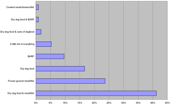 114 mensen hebben antwoord gegeven op deze vraag en dit zijn de antwoorden. Interessante ontwikkeling is dat bij elkaar opgeteld 75% dagelijks rauw vlees/vis te eten krijgt, in de vorm van delen van een dier, of ontdooid gemalen vlees/vis (KVV noemen we dat). Honden houden doorgaans meer van vlees dan van brokken als ze mogen kiezen, heb ik de indruk. De holistische dierenartsen zijn voorstander van vlees, terwijl traditionele dierenartsen meestal voor brokken zijn. Op dagelijks niveau doen ze het goed op allebei, maar welke categorie nu het gezondst oud wordt – dat zou interessant zijn om te analyseren en dan pas kun je concluderen wat nu het beste is voor een hond. De voorstanders van vlees zijn dit omdat ze vinden dat granen en rijst niet gezond zijn voor honden, en de meeste brokken worden nu eenmaal gemaakt met een hoog aandeel granen.