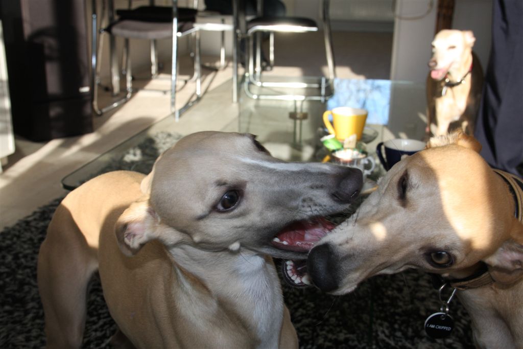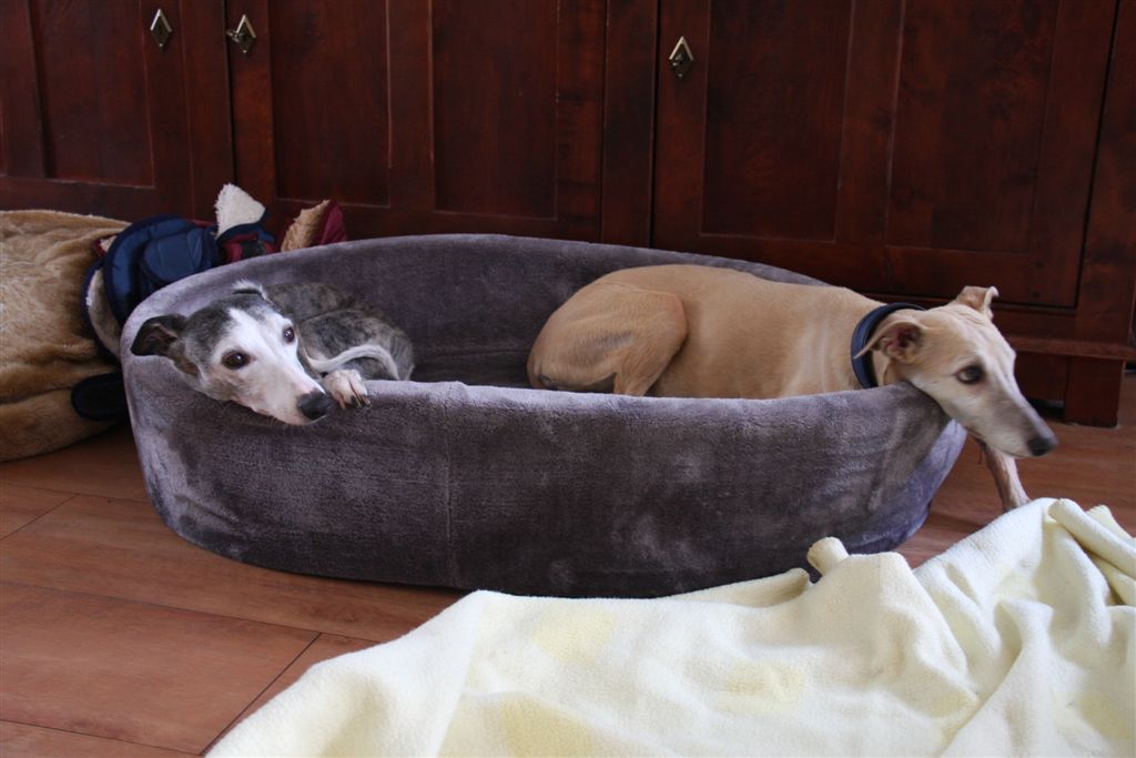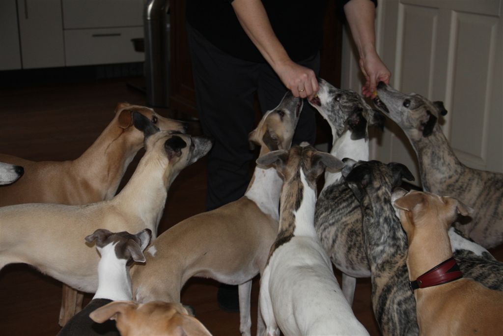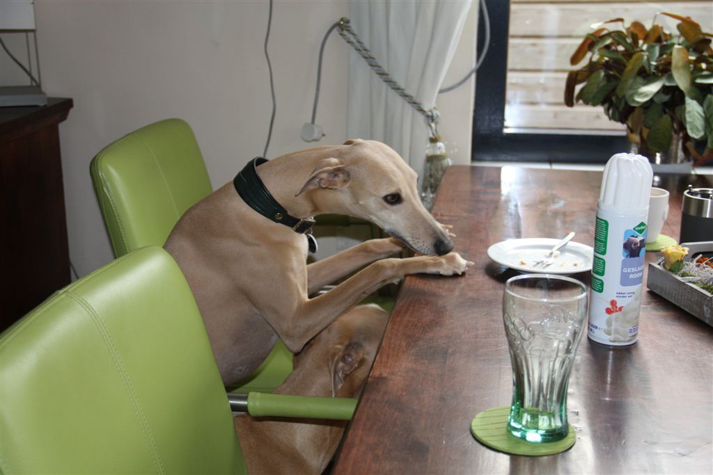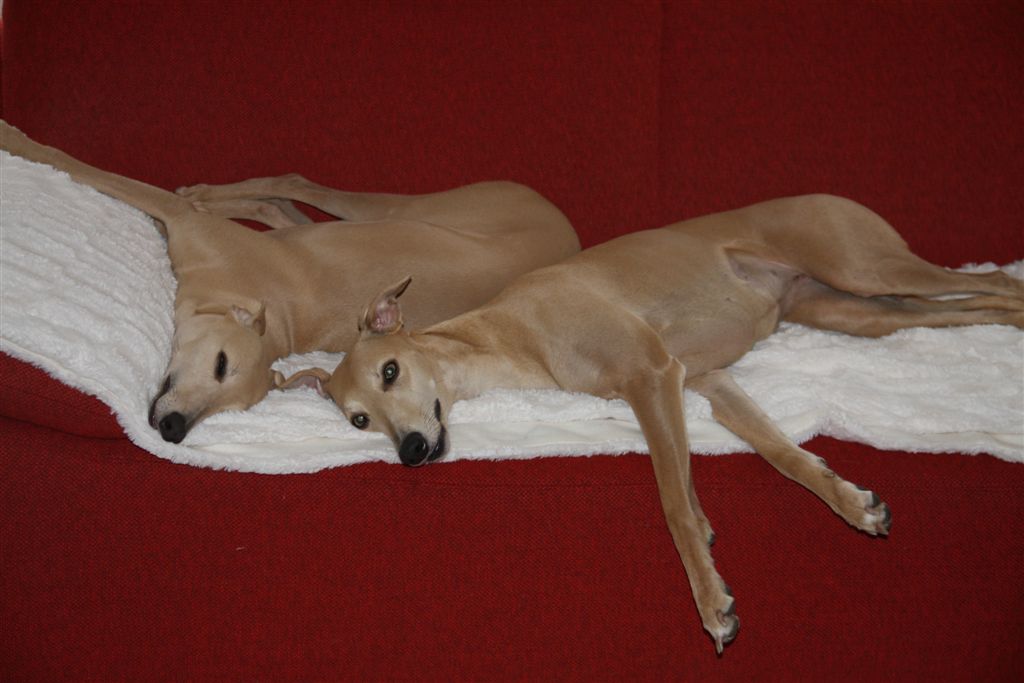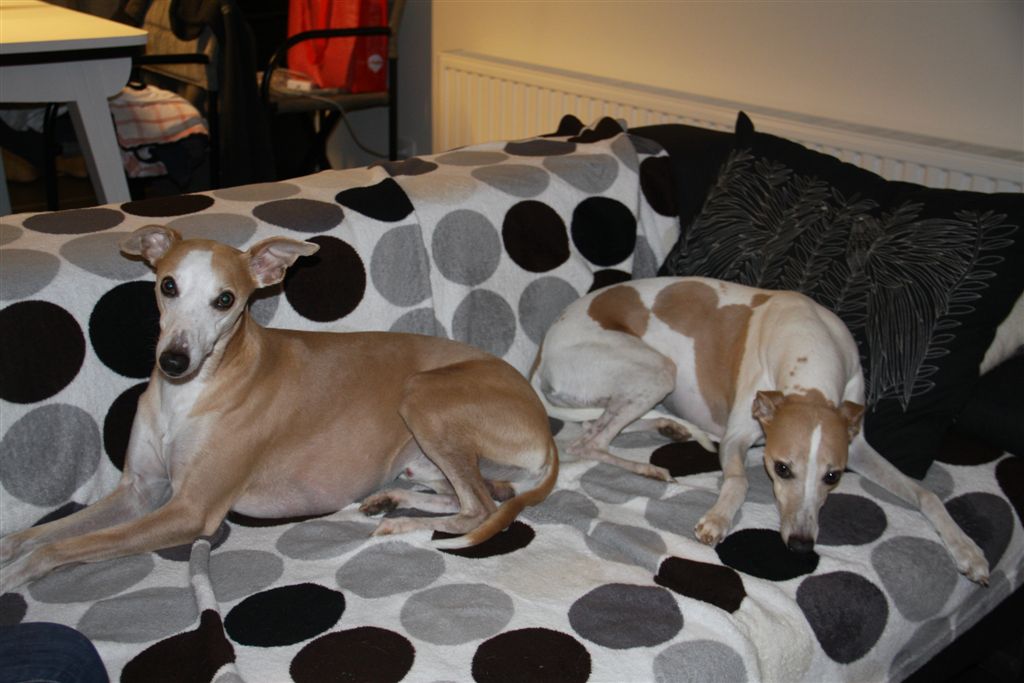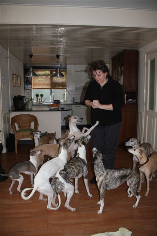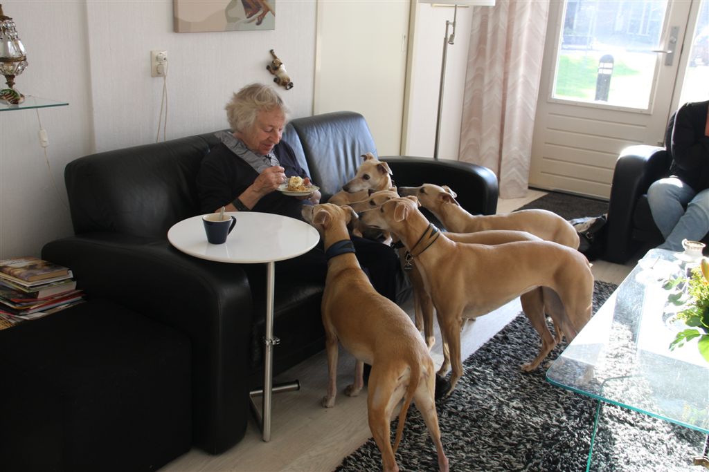 De afgelopen weken werd de whippetgemeenschap weer eens met de neus op de feiten gedrukt; whippets worden gemiddeld 13 jaar oud plus een paar maanden, maar net zoals we heel veel uitschieters ver naar boven kennen, moeten er ook uitschieters naar beneden zijn, anders kom je niet aan zo’n gemiddelde. Alleen willen wij die uitschieters naar beneden niet kennen, laat staan zelf meemaken. En toch gebeurt het, in de afgelopen drie weken hebben verschillende mensen in mijn directe omgeving hun geliefde whippet veel te vroeg over de regenboogbrug moeten laten gaan, door ziekte of ongeluk. Ik kijk met name in deze dagen met veel meer aandacht en dankbaarheid naar mijn vier dames, wanneer ze na hun wandeling volgegeten hun favoriete plekje opzoeken in huis. Het is allemaal niet zo vanzelfsprekend, en die momenten wil ik wel wat bewuster gaan koesteren.