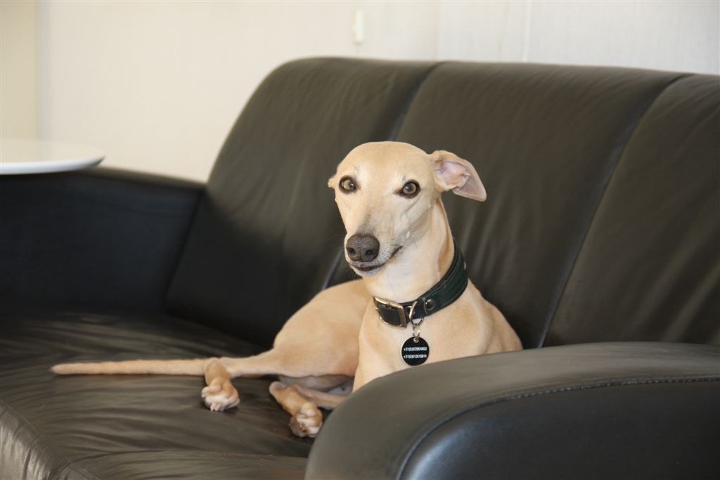 Ik was daar als bezoeker op de jongehonden- en veteranenshow van de Belgische Whippet Club en bezocht na afloop bij Evelien en Wim ons andere Sandje in België, Zoë (Salty Sand’s Anyone’s Daughter). Het is grappig, Zoë is een van de zeldzame bontjes in onze nesten, en tegelijkertijd lijkt zij ondanks de andere kleur in haar maniertjes en oogopslag heel erg op haar oma Chloe.