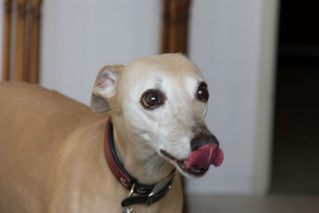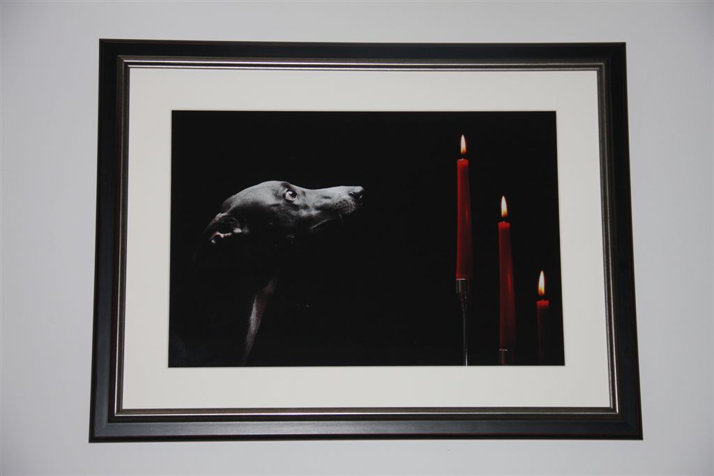 Wie bij mij thuis is geweest weet het: het is veel wit en rood wat de klok slaat. Sinds kort prijkt er een fraaie ingelijste foto aan de muur, van Skye, de blauwe whippet van mijn whippetvriendin Karin Schellner uit Wenen. De foto werd gemaakt door haar zwager, de engelse fotograaf Dan Shalloe. Een juweeltje, vind ik zelf.