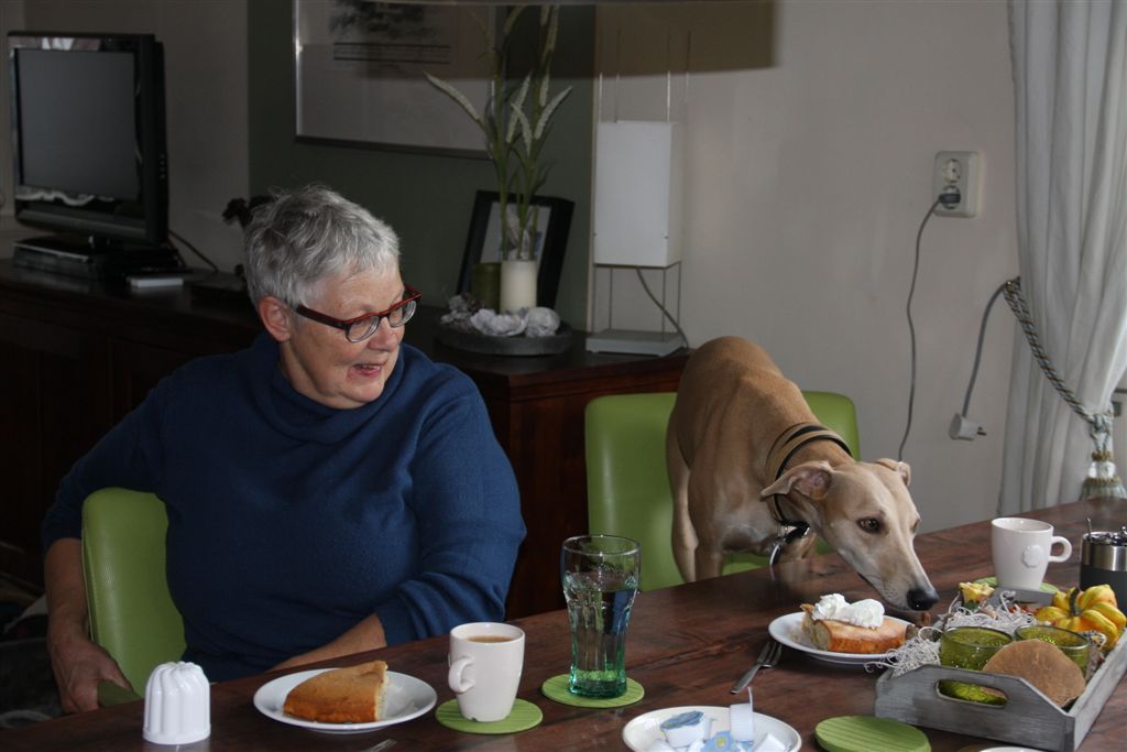 De honden voelen zich er ook thuis, want aan de inrichting is helemaal niets veranderd sinds de verhuizing. Hinde kijkt hier wat scheel, dat doet ze altijd wanneer ze je een liefdevolle blik toewerpt. Daktari!