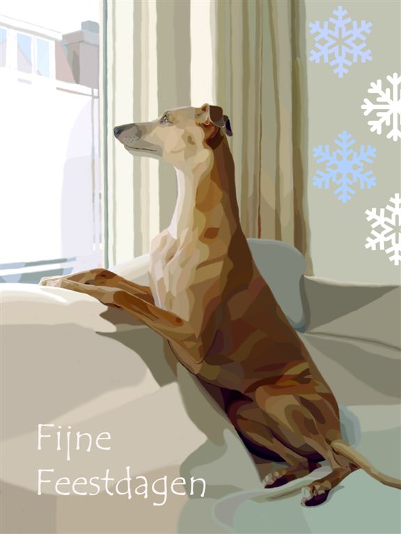 Wie bij mij thuis is geweest weet het: het is veel wit en rood wat de klok slaat. Sinds kort prijkt er een fraaie ingelijste foto aan de muur, van Skye, de blauwe whippet van mijn whippetvriendin Karin Schellner uit Wenen. De foto werd gemaakt door haar zwager, de engelse fotograaf Dan Shalloe. Een juweeltje, vind ik zelf.