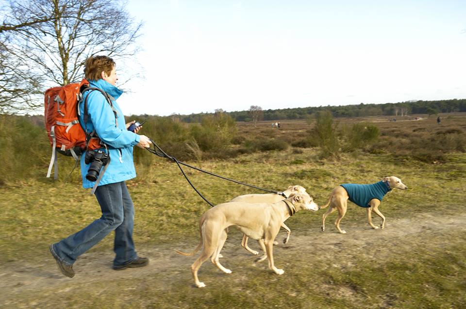 Toch had ik Hinde en Hazel op bepaalde stukken aan de riem; daar waar ze er altijd even vandoor gaan en niet meer weg zijn te rammen uit een bolwerk van konijnenholen, bijvoorbeeld. En… waar Hazel is, is Megan ook ;>). Foto van Andrea.
