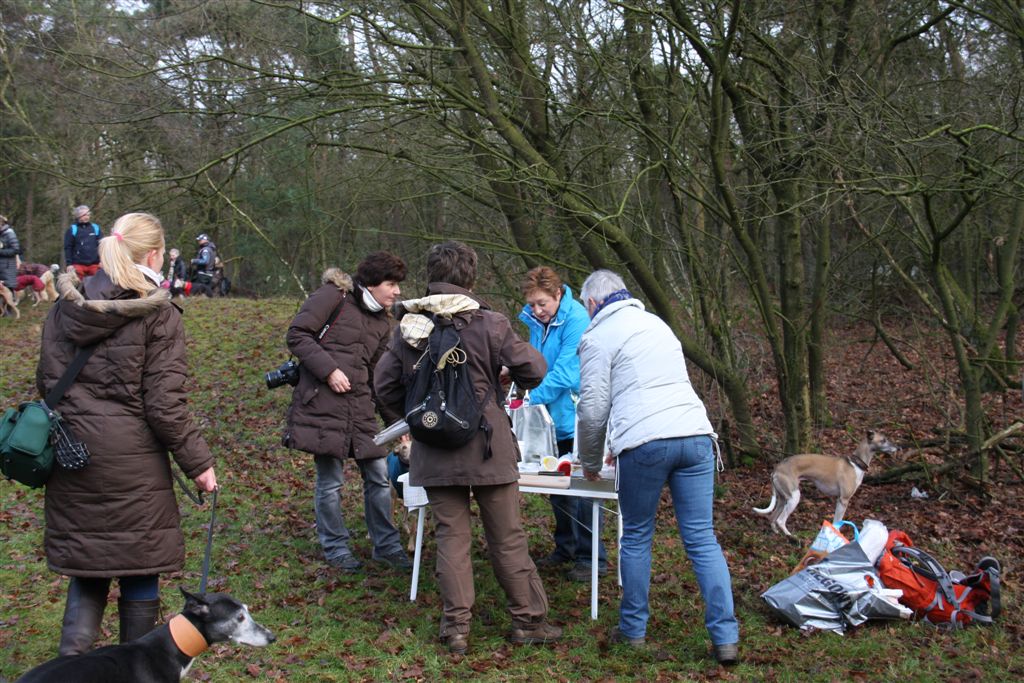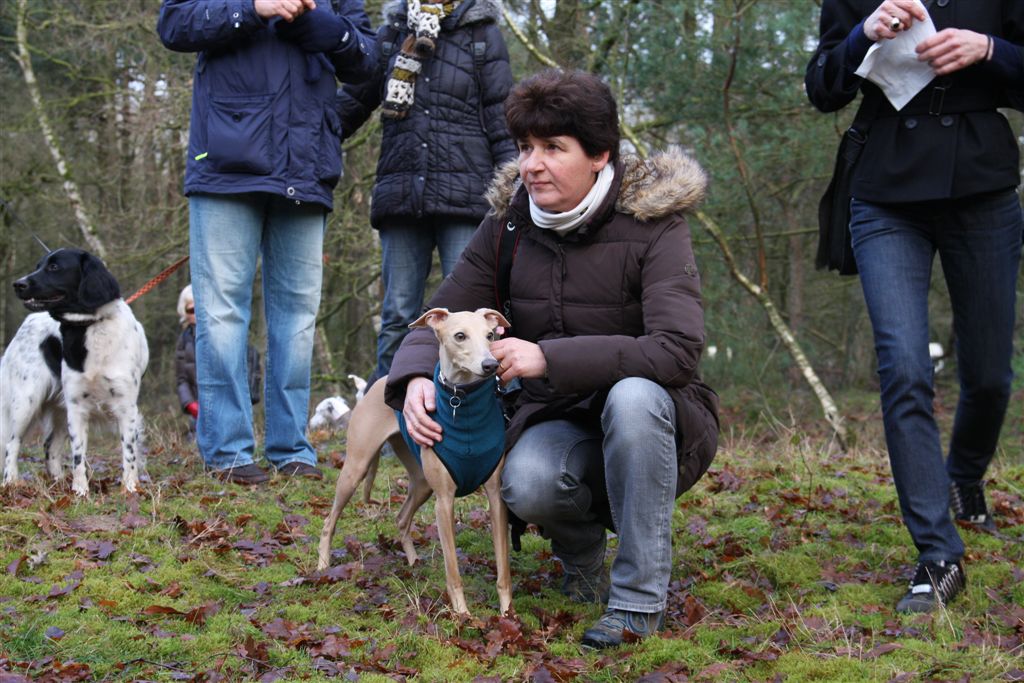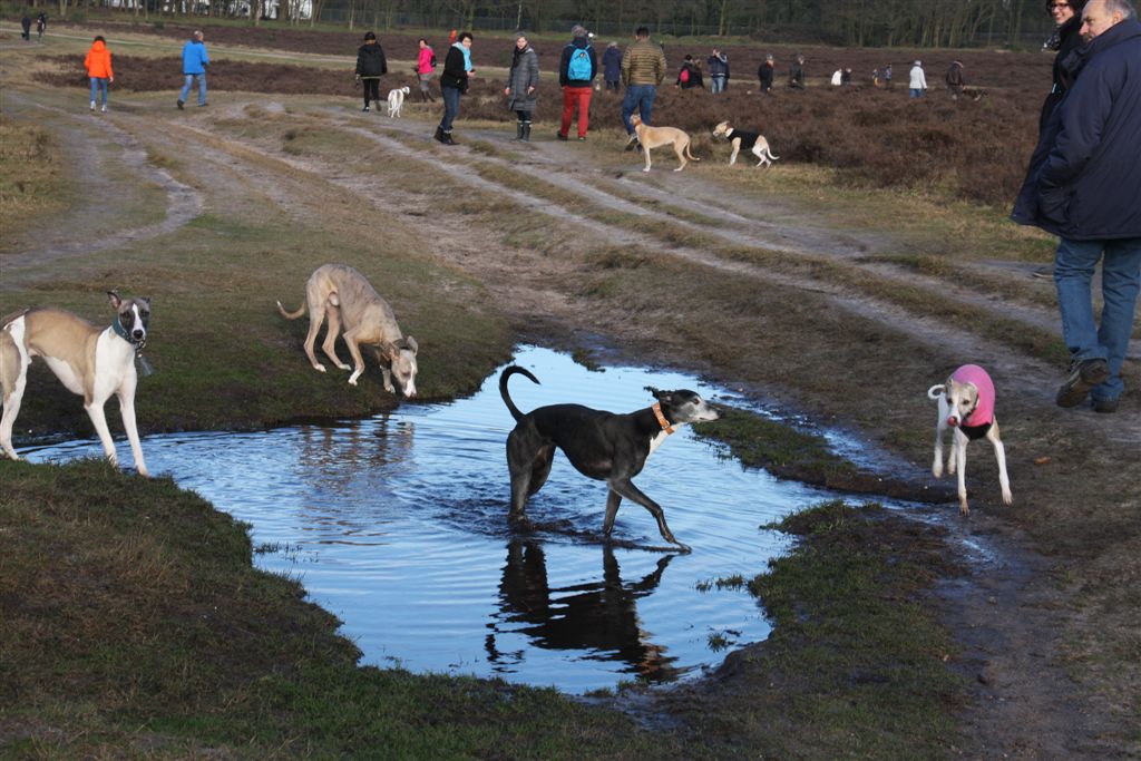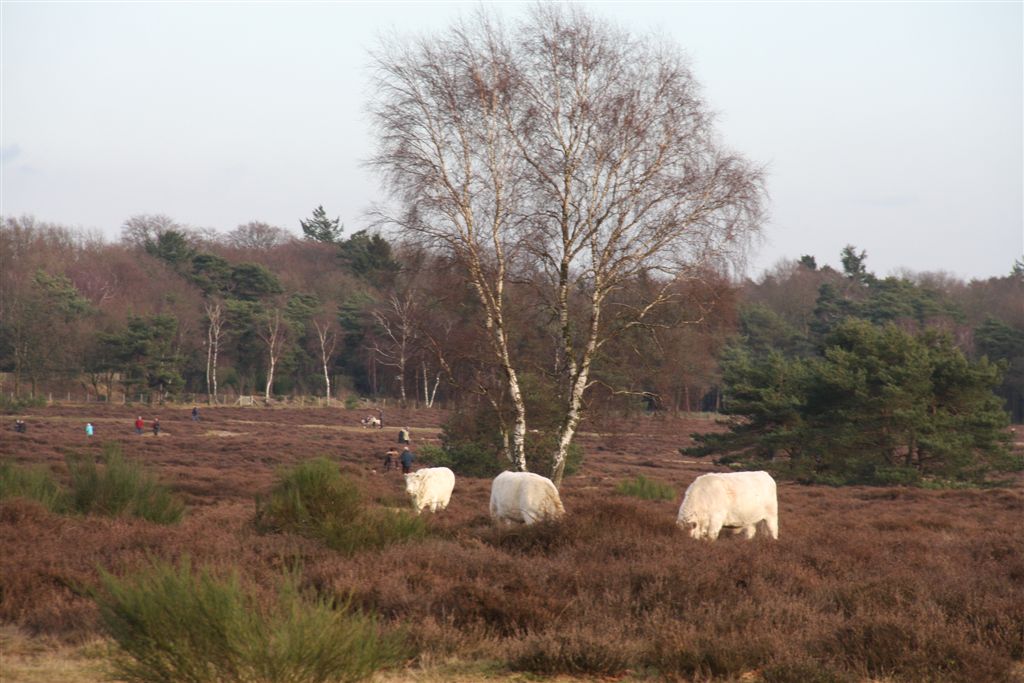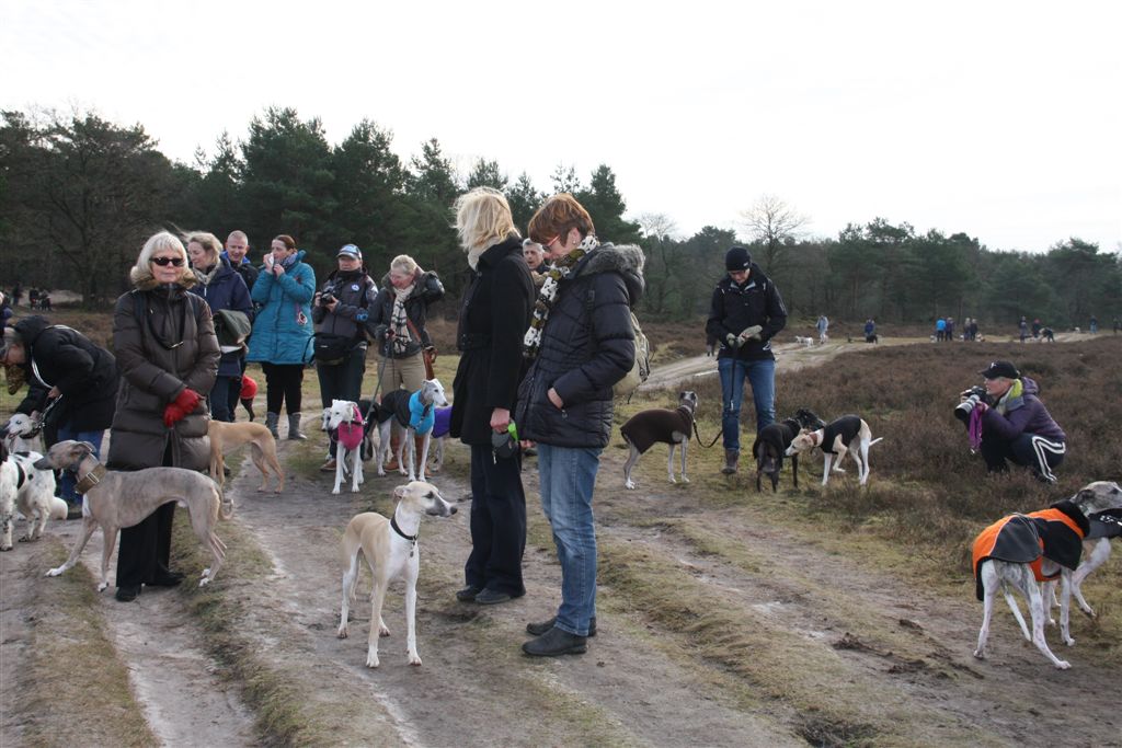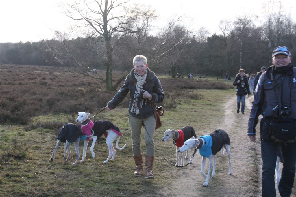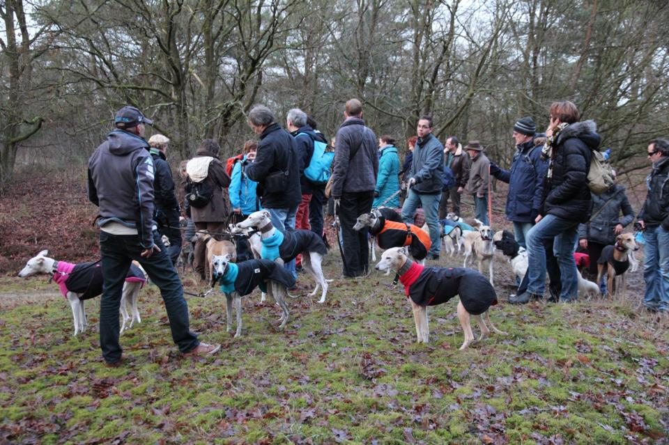 Deze keer stonden de koeien in het midden van de hei; dit gebied is een begrazingsproject, dus netjes omheind. En toch mogen de honden er officieel los lopen. Dat maakt het tot een bijzonder populair wandelgebied; alleen al op deze dag liepen de Ierse Setter club en de Petit Griffon Vendéen club bijvoorbeeld ook hun nieuwjaarswandeling. Voordeel: al het wild maakt zich uit de voeten, en dus is het rustig wandelen met je windhonden.