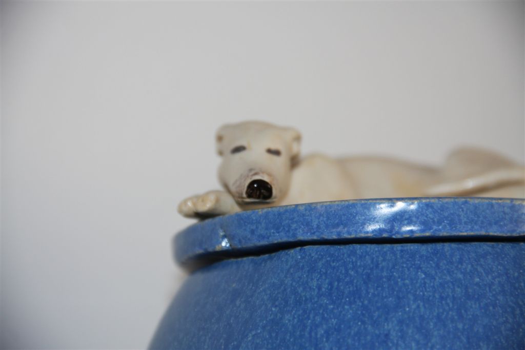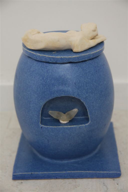 Marianne maakte in de afgelopen weken deze bijzondere urn voor Jewel. Het deel van Jewel’s as dat ik niet zal uitstrooien wil ik hierin bewaren. Het glazuur is blauw, omdat dat Jewel’s kleur was; haar halsband en haar jas waren ook blauw. Het gouden pootafdrukje is een symbolische knipoog naar iets dat aan de orde is geweest op de dag van Jewel’s afscheid.